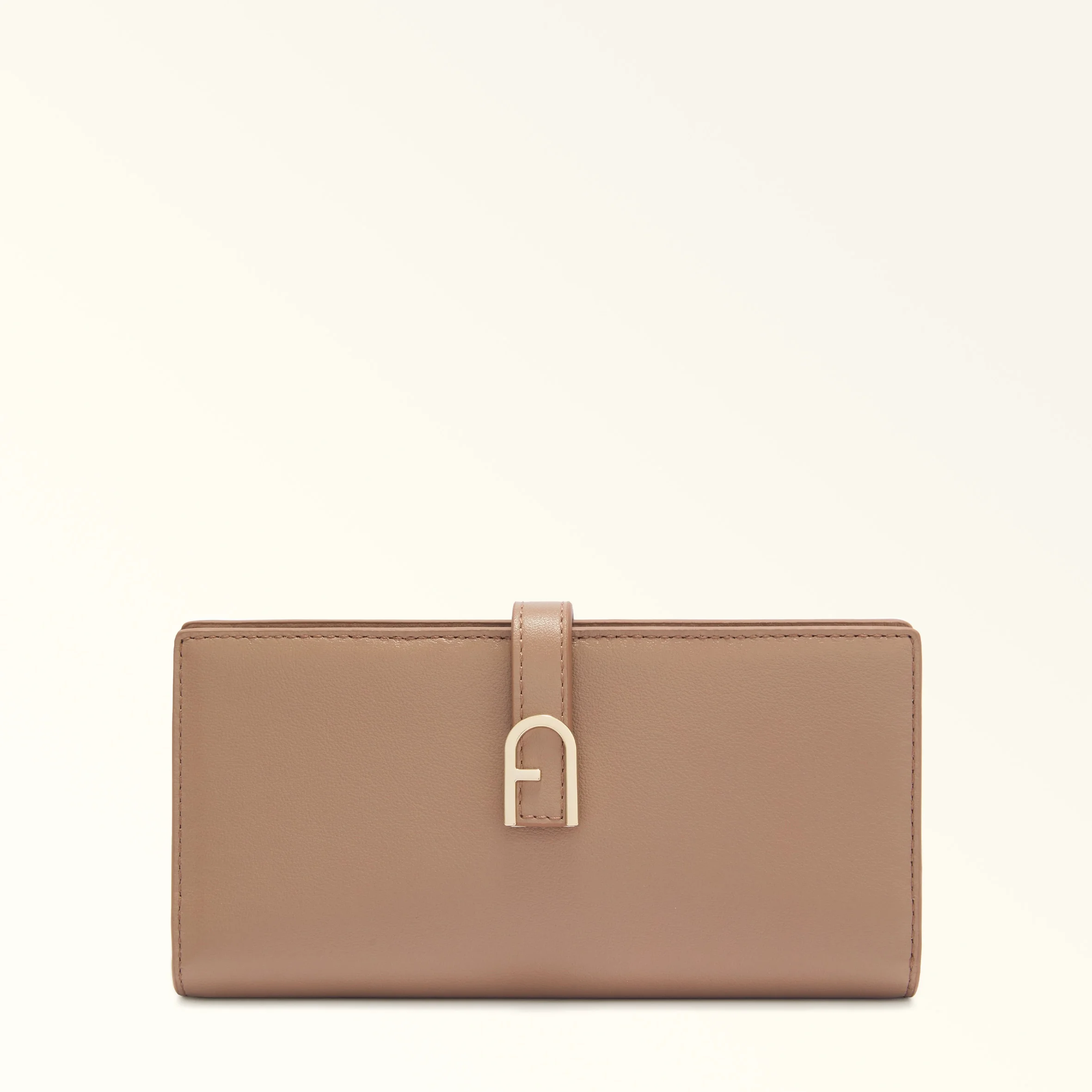 This Furla Flow continental wallet is styled in fine leather with a soft hand. A joy to touch, the super-slim bi-fold design is practical and convenient, in that it can easily fit into a bag or backpack, or even an elegant clutch. While the inside is carefully organised to hold cards, documents and banknotes, the outside boasts a press-stud closure embellished with an iconic Arch logo. - Seven inner credit card and ID slots - Inner compartment for banknotes - Three flat pockets - Zipped inner pocket Details Interior Details: 7 Cc Slots 1 Banknotes Pocket 3 Flat Pockets 1 Zipped Pocket Material: Claris Lux Calf Leather Closure: Snap Button Closure Hardware: Furla Arch Gasket Product Code: WP00402BX204510071257S Internal Composition: 100% Viscose External Composition: 100% Leather Plating: Gold Dimensions in INCH 7,28 x 3,74 x 0,79 (w x h x d)