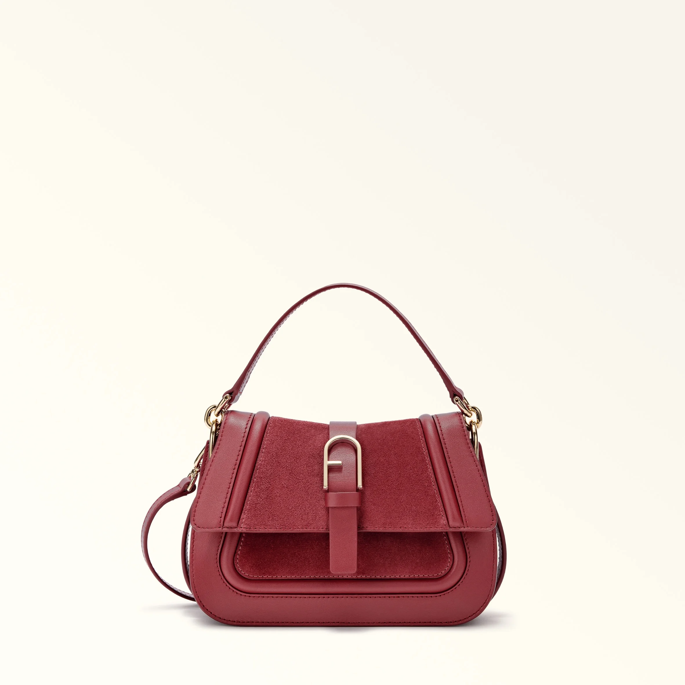 The mini Furla Flow top-handle bag is a sophisticated accessory in soft suede leather, its refined silhouette embellished with smooth leather details. Carried in the hand, on the shoulder or across the body, its versatile elegance is ready for whatever your day might hold. A decorative buckle embellished with the iconic Arch logo on the front adds a distinctive touch. - Open inside pocket - Short top handle in smooth leather - Long adjustable and removable strap in smooth leather - Magnetic button flap closure - Furla logo printed on the back Details Interior Details: 1 Flat Open Pocket Exterior Details: Furla Punched Logo/Single Handle Material: Claris Lux Calf Leather + Suede Strap information: Removable/adjustable leather strap Strap Length Max: 43.31 in Strap Length Min: 39.37 in Closure: Magnet Closure Product Code: WB01884BX25671007T1R00 Plating: Gold Weight: 0.54 kg Dimensions in INCH 8,66 x 5,31 x 3,35 (w x h x d)