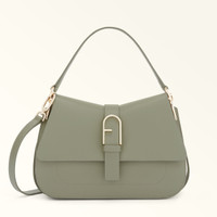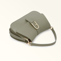 A sleek yet functional piece, this elegant Furla Flow bag is distinctive with its compact trapezoid shape and curved lines. An ideal companion for any occasion because of the versatility it affords, it can be carried by hand, worn on the shoulder or crossbody. It is crafted from soft and smooth nappa leather, and features a decorative buckle in the shape of the iconic Arch logo. - Open inside pocket - Open outside pocket on the back - Short leather top handle - Adjustable and removable long leather strap - Flap and magnetic button closure - Punched Furla logo Details Interior Details: 1 Flat Open Pocket Exterior Details: Furla Logo/Single Handle/Open Pocket On The Back Material: Claris Lux Calf Leather Strap information: Removable/adjustable leather strap Strap Length Max: 42.52 in Strap Length Min: 37.6 in Closure: Magnet Closure Hardware: Furla Arch Gasket Product Code: WB00996BX20451007AG700 Internal Composition: 50% Nylon 50% Polyurethane External Composition: 100% Leather Plating: Gold Dimensions in INCH 9,84 x 6,1 x 3,15 (w x h x d)