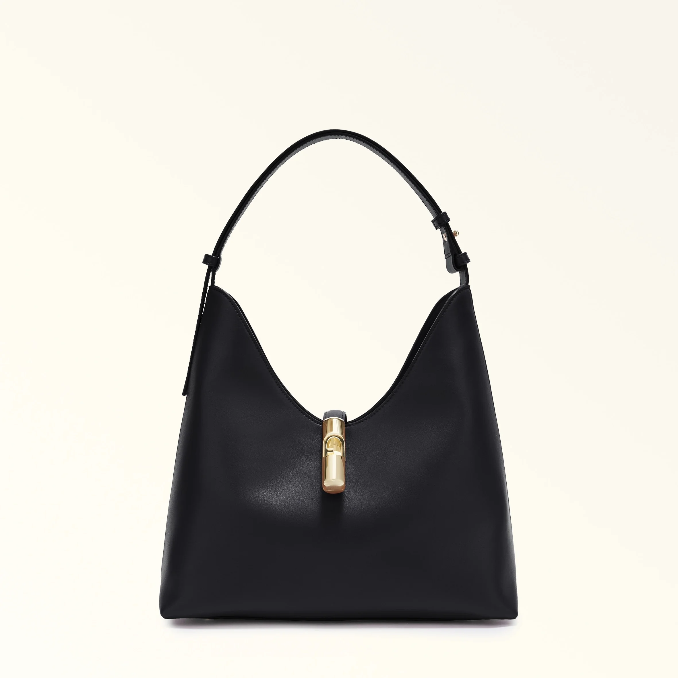 The soft silhouette and relaxed structure of this Furla Goccia hobo bag gives it a sleek and contemporary accent. Styled in silky smooth leather with a rich feel, it is roomy enough inside to hold all your essentials. The new cylindrical hardware reminiscent of a weight, decorated with the iconic Furla Arch logo, adds a distinctive finishing touch on the matching strap. - Open inside pocket - Inside zip pocket - Adjustable leather handle Interior Details 2 Flat Open Pockets/1 Zipped Pocket Exterior Details Furla Punched Logo/Single Handle Material Sidney Calf Leather Hardware Metal Feet Product Code WB01499BX31041007O6000 Internal Composition 100% Polyester External Composition 100% Leather Plating Gold Dimensions in INCH 11,81 x 12,01 x 6,3 (w x h x d)