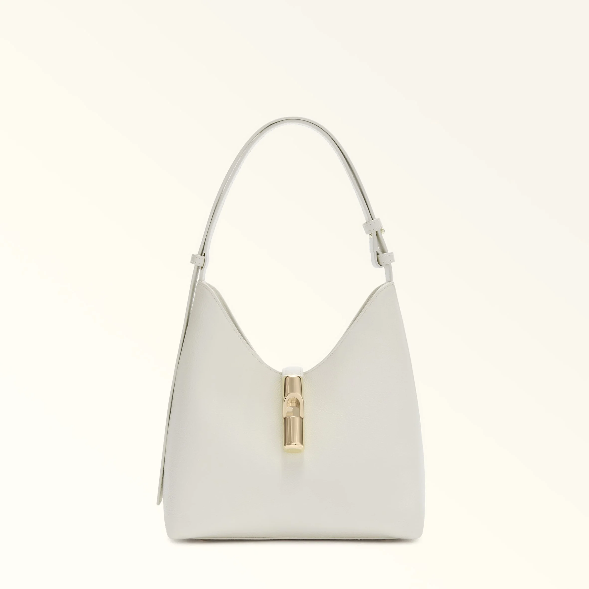 Made from smooth leather and printed calfskin, the Furla Goccia hobo bag stands out for its soft, unstructured shape. The bag is enhanced by a tab matching the adjustable contrasting leather handle. New weighted cylindrical hardware with the Furla Arch logo fastens the accessory with elegance. - Open inside pocket - Inside zip pocket Details Exterior Details: Furla Punched Logo/Single Handle Material: Night Calf Leather Strap Length Max: 35.63 in Strap Length Min: 30.91 in Hardware: Metal Feet Product Code: WB01979BX33531007PNN00 Plating: Gold Dimensions in INCH 9,45 x 9,45 x 4,72 (w x h x d)