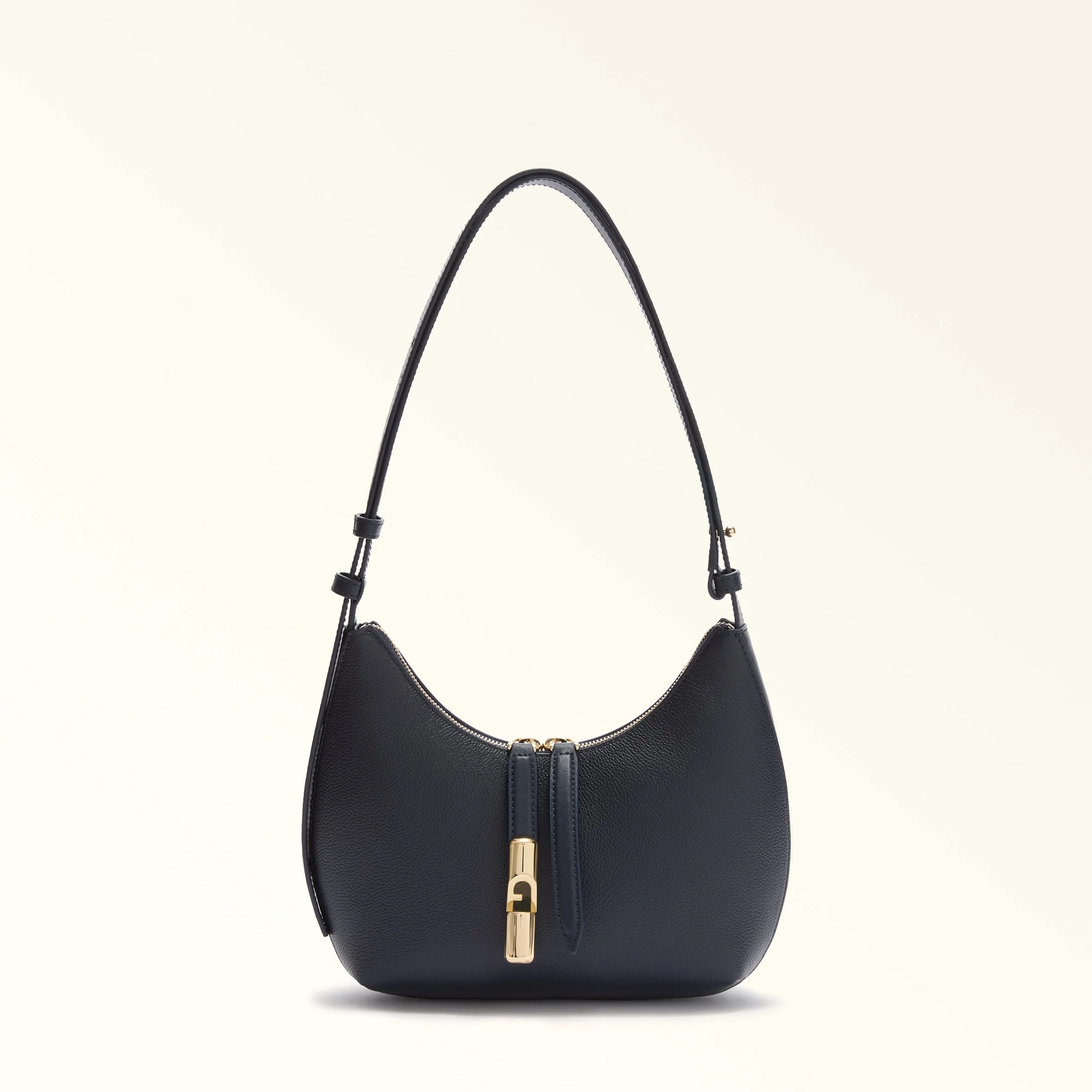 This Furla Goccia shoulder bag is styled in grained leather with contrasting details in smooth leather, and finished with a two-way zip embellished with the unusual cylindrical glossy-finish hardware with the Arch logo on one of the leather pullers. With sleek, curved lines, the rounded shape is compact yet spacious enough for your daily essentials. - Open inside pocket - Inside zip pocket - Adjustable smooth leather handle Details Exterior Details: Furla Punched Logo Material: Night Calf Leather + Sidney Calf Leather Strap information: Fixed/Adjustable Shoulder Strap Closure: Top Zipper Closure Product Code: WB01500BX335310074852S Internal Composition: 100% Polyester External Composition: 100% Leather Plating: Gold Weight: 0.57 kg Dimensions in INCH 8,66 x 8,27 x 2,95 (w x h x d)