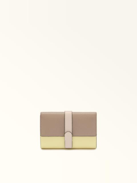 A compact, functional wallet that you can store in any bag. Furla Grazia stands out for its mixture of materials: smooth leather and contrasting grained details for a colour-block effect. The tri-fold design opens up like a book and features a spacious inner coin pocket with zip. - Fifteen inner credit card and ID slots - Inner compartment for banknotes - Flap and press-stud closure - Furla logo embossed on the front Details Material: Roma Soft Calf Leather Colorblock + Grained Calf Leather Hardware: Metal Zip Puller Product Code: WP00498BX158810074053S Internal Composition: 100% Viscose External Composition: 100% Leather Plating: Gold Dimensions in INCH 5,51 x 3,54 x 1,18 (w x h x d)