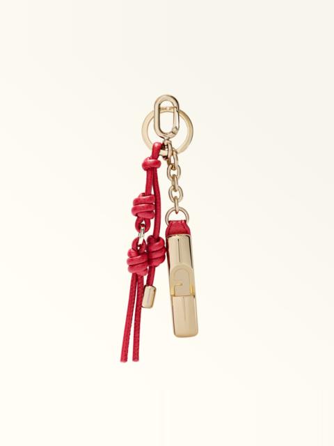 The Furla Iride keyring features a cylindrical metal pendant engraved with the iconic Arch logo. Complete with two knotted leather straps, it's perfect for adding a distinctive touch to a bunch of keys or your favourite bag. - Snap hook and ring with engraved Furla logo Details Exterior Details: Furla Logo Engraved On The Metal Material: Textured Leather + Metal Product Code: WR00883AME0001007CGO00 Plating: Gold Dimensions in INCH 0,79 x 8,27 x 0,79 (w x h x d)
