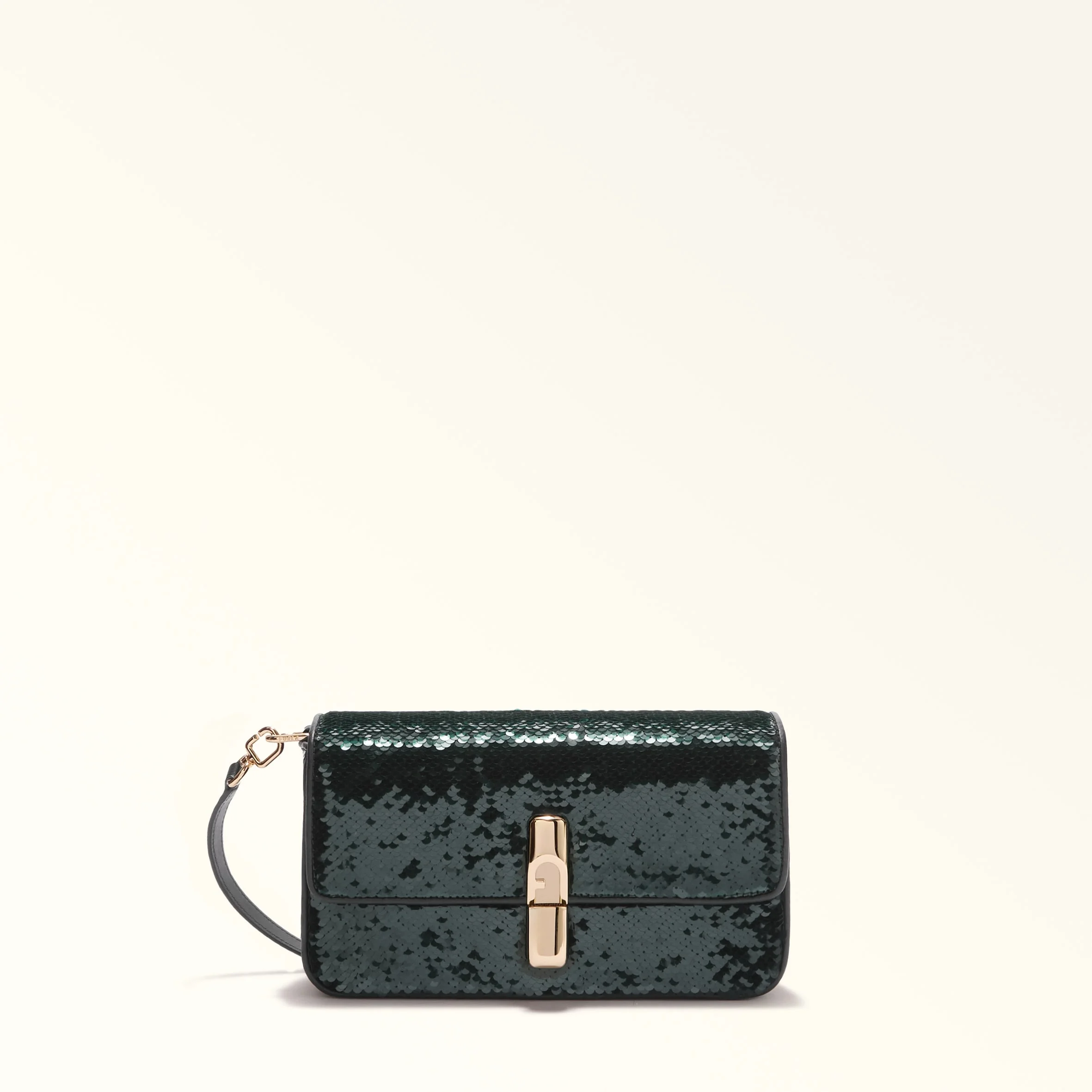 Versatile, contemporary, compact: the Furla Iride crossbody is made of a fabric covered in elegant sparkling sequins and features a matching adjustable, detachable shoulder strap for multiple styling options. Its magnetic closure is embellished with cylindrical metal hardware, finished with the iconic Furla Arch logo. - Inside zip pocket - Printed Furla logo Details Interior Details: 1 Zipped Pocket Material: Paillettes Fabric Strap information: Removable/adjustable leather strap Strap Length Max: 46.46 in Strap Length Min: 41.34 in Product Code: WB01950BX137710074491S Plating: Gold Dimensions in INCH 9,45 x 5,12 x 2,36 (w x h x d)