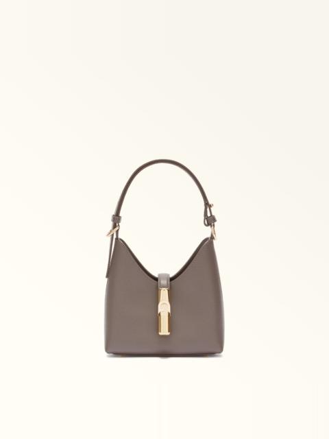 Made from printed leather, the Furla Iride mini hobo bag stands out for its soft trapezoidal shape. The accessory's matching tab is embellished with the brand's weighted cylindrical hardware and the iconic Furla Arch logo, keeping it safely fastened. Its compact open interior holds all your essentials. - Inside zip pocket - Adjustable leather handle - Metal feet - Punched Furla logo Details Interior Details: 1 Zipped Pocket Exterior Details: Furla Punched Logo Material: Textured Leather Strap information: Removable/adjustable leather strap Strap Length Max: 23.62 in Strap Length Min: 19.09 in Product Code: WE00820ARE0001007GU000 Plating: Gold Dimensions in INCH 6,89 x 7,28 x 3,94 (w x h x d)