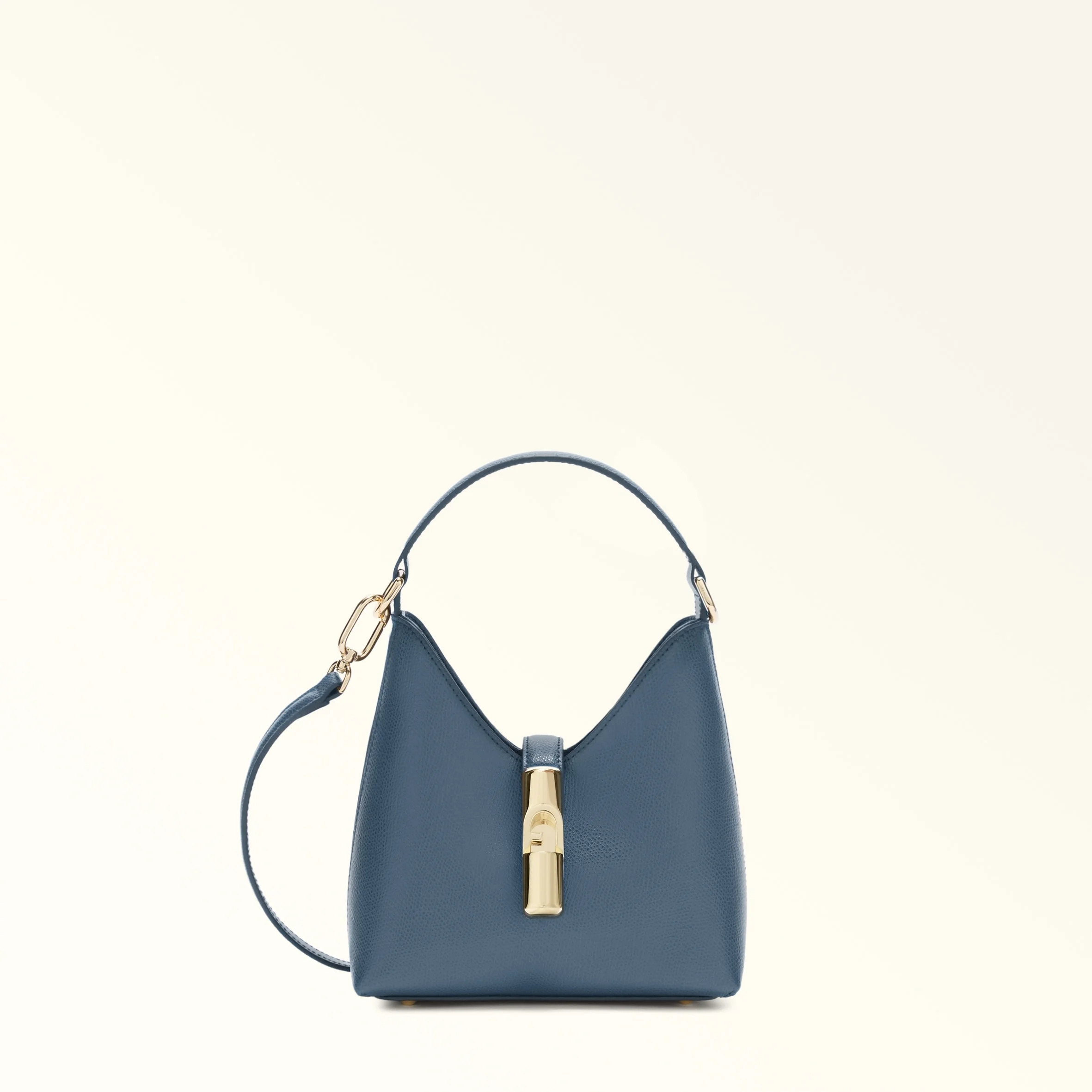Made from printed leather, the Furla Iride mini hobo bag stands out for its soft trapezoidal shape. The accessory's matching tab is embellished with the brand's new cylindrical hardware and the iconic Furla Arch logo. Its compact open interior holds all your essentials. Equipped with a detachable adjustable strap, it can be worn as both a top-handle and on-the-shoulder style for added versatility. - Inside zip pocket - Metal feet - Punched Furla logo Details Interior Details: 1 Zipped Pocket Material: Textured Leather Strap information: Removable/adjustable leather strap Strap Length Max: 38.98 in Strap Length Min: 33.86 in Product Code: WE00876ARE0001007GU000 Plating: Gold Weight: 0.53 kg Dimensions in INCH 7,28 x 7,48 x 3,94 (w x h x d)