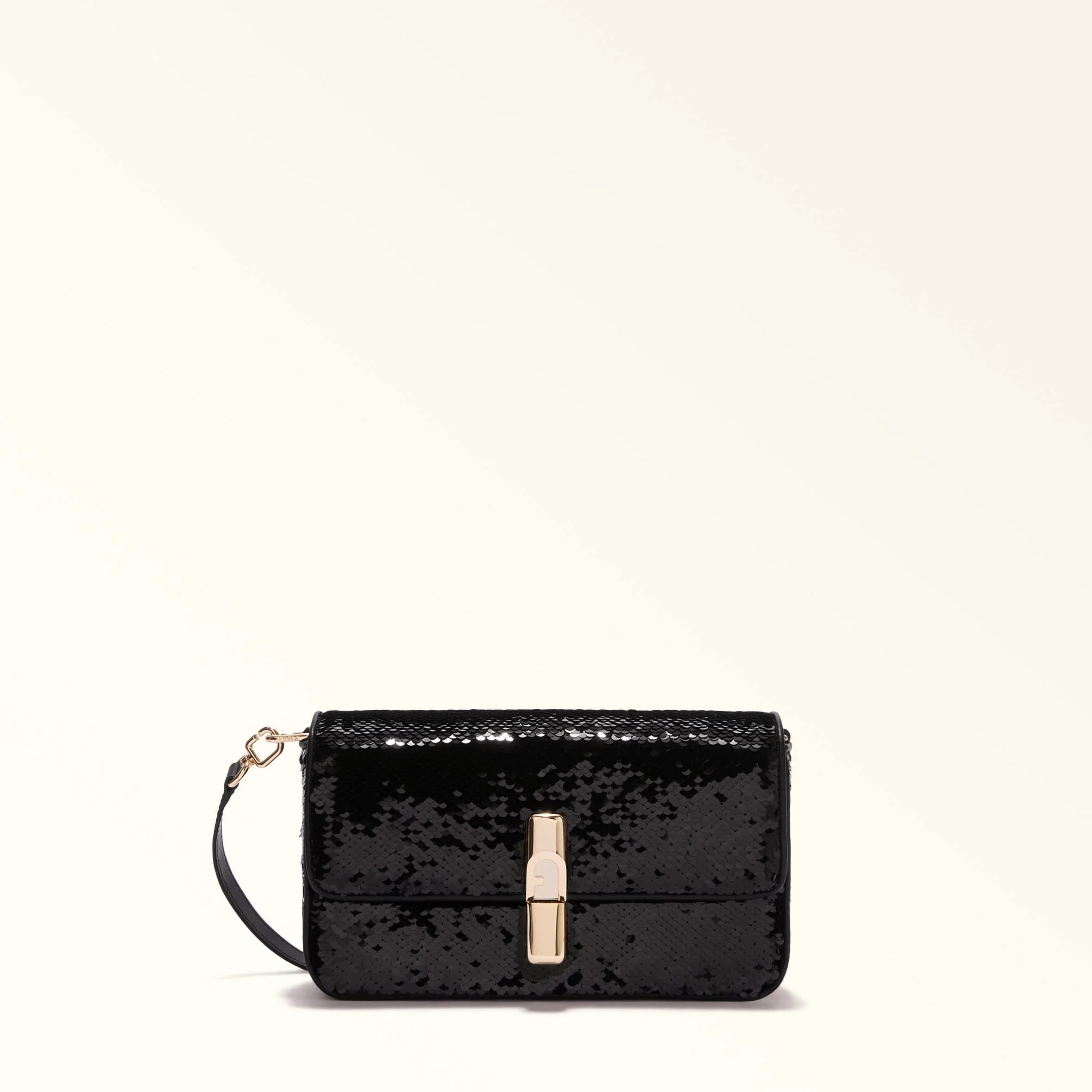 Versatile, contemporary, compact: the Furla Iride crossbody is made of a fabric covered in elegant sparkling sequins and features a matching adjustable, detachable shoulder strap for multiple styling options. Its magnetic closure is embellished with cylindrical metal hardware, finished with the iconic Furla Arch logo. - Inside zip pocket - Printed Furla logo Details Interior Details: 1 Zipped Pocket Material: Paillettes Fabric Strap information: Removable/adjustable leather strap Strap Length Max: 46.46 in Strap Length Min: 41.34 in Product Code: WB01950BX13771007O6000 Plating: Gold Dimensions in INCH 9,45 x 5,12 x 2,36 (w x h x d)