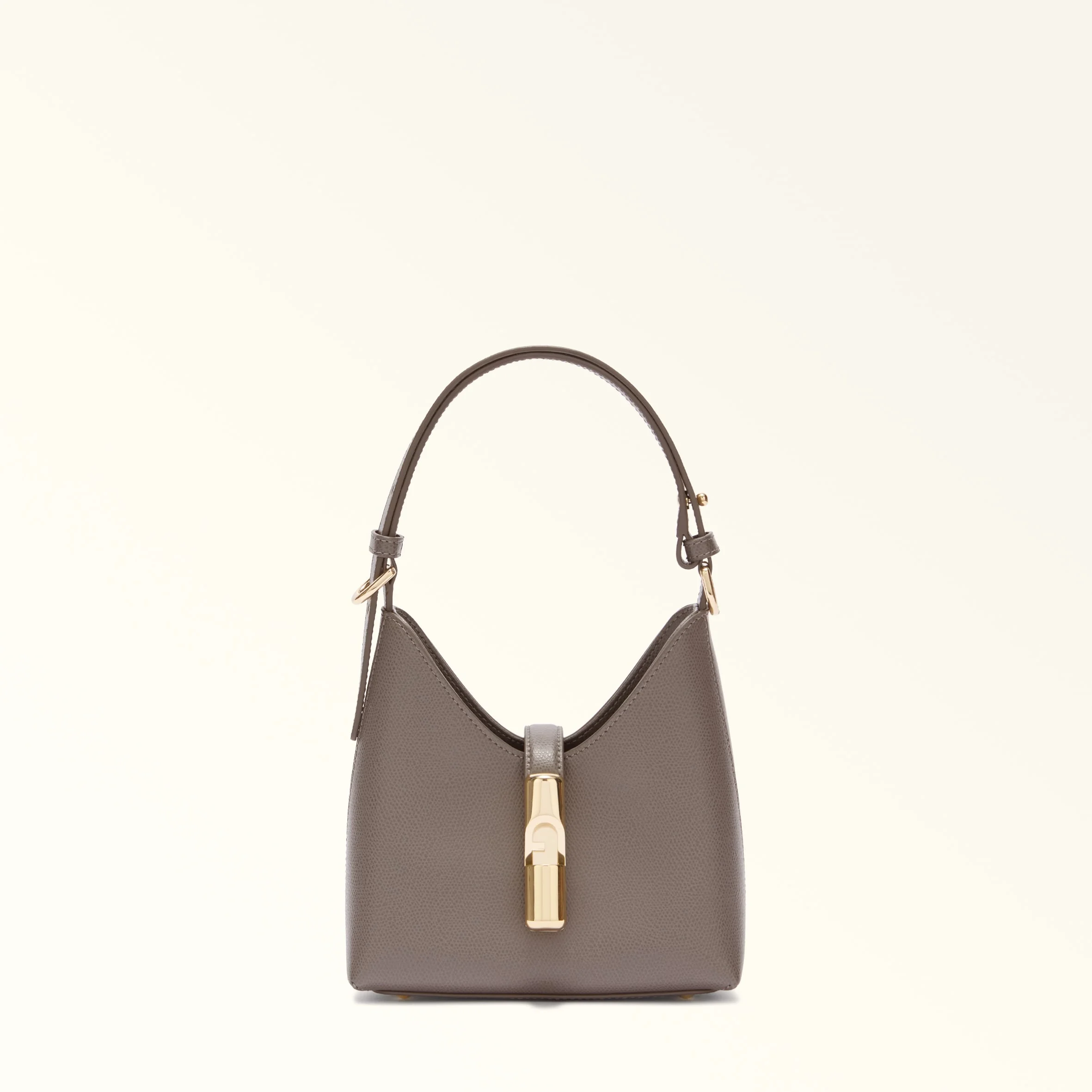 Made from printed leather, the Furla Iride mini hobo bag stands out for its soft trapezoidal shape. The accessory's matching tab is embellished with the brand's weighted cylindrical hardware and the iconic Furla Arch logo, keeping it safely fastened. Its compact open interior holds all your essentials. - Inside zip pocket - Adjustable leather handle - Metal feet - Punched Furla logo Details Interior Details: 1 Zipped Pocket Exterior Details: Furla Punched Logo Material: Textured Leather Strap information: Removable/adjustable leather strap Strap Length Max: 23.62 in Strap Length Min: 19.09 in Product Code: WE00820ARE00010074283S Plating: Gold Dimensions in INCH 6,89 x 7,28 x 3,94 (w x h x d)