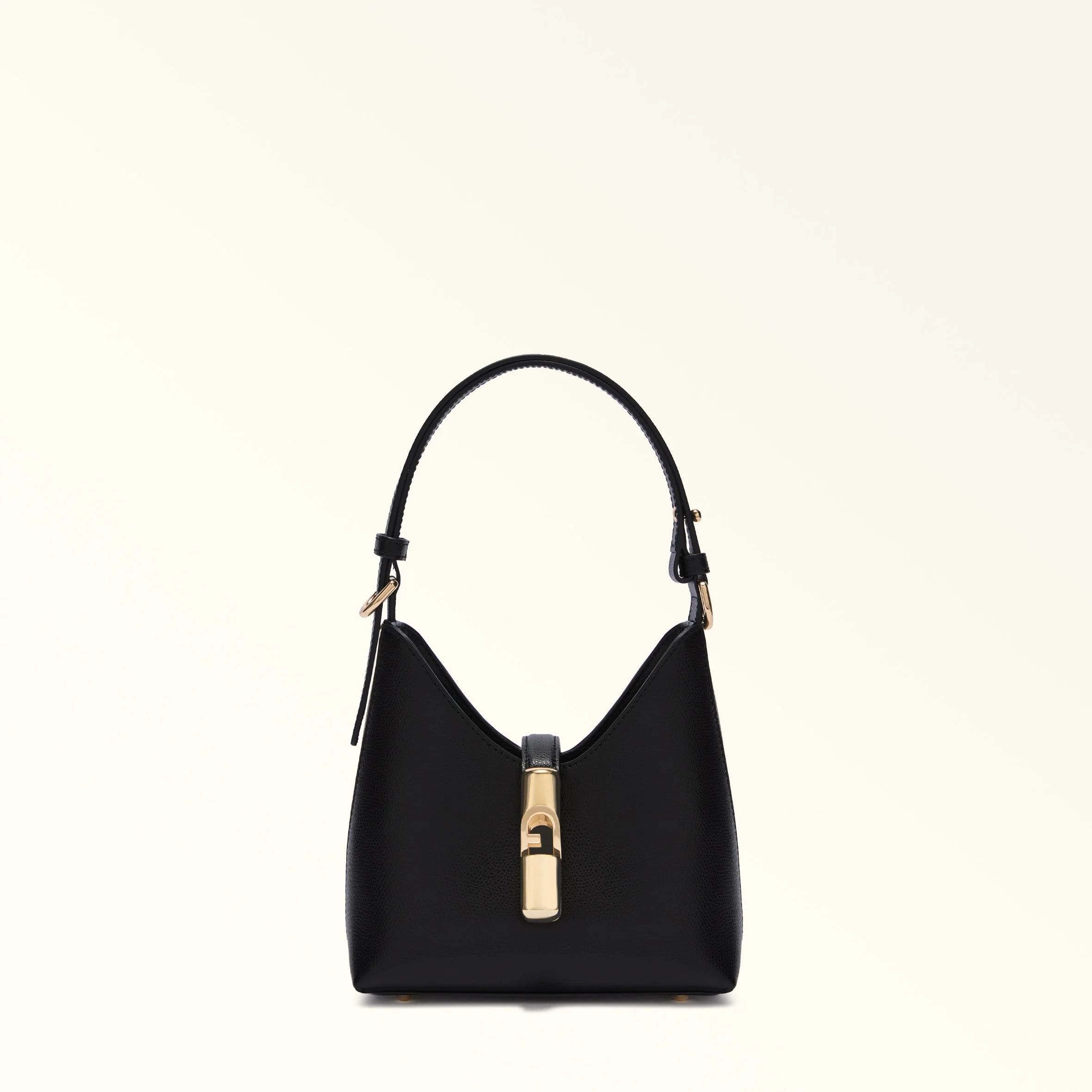 Made from printed leather, the Furla Iride mini hobo bag stands out for its soft trapezoidal shape. The accessory's matching tab is embellished with the brand's weighted cylindrical hardware and the iconic Furla Arch logo, keeping it safely fastened. Its compact open interior holds all your essentials. - Inside zip pocket - Adjustable leather handle - Metal feet - Punched Furla logo Details Interior Details: 1 Zipped Pocket Exterior Details: Furla Punched Logo Material: Textured Leather Strap information: Removable/adjustable leather strap Strap Length Max: 23.62 in Strap Length Min: 19.09 in Product Code: WE00820ARE0001007O6000 Plating: Gold Dimensions in INCH 6,89 x 7,28 x 3,94 (w x h x d)