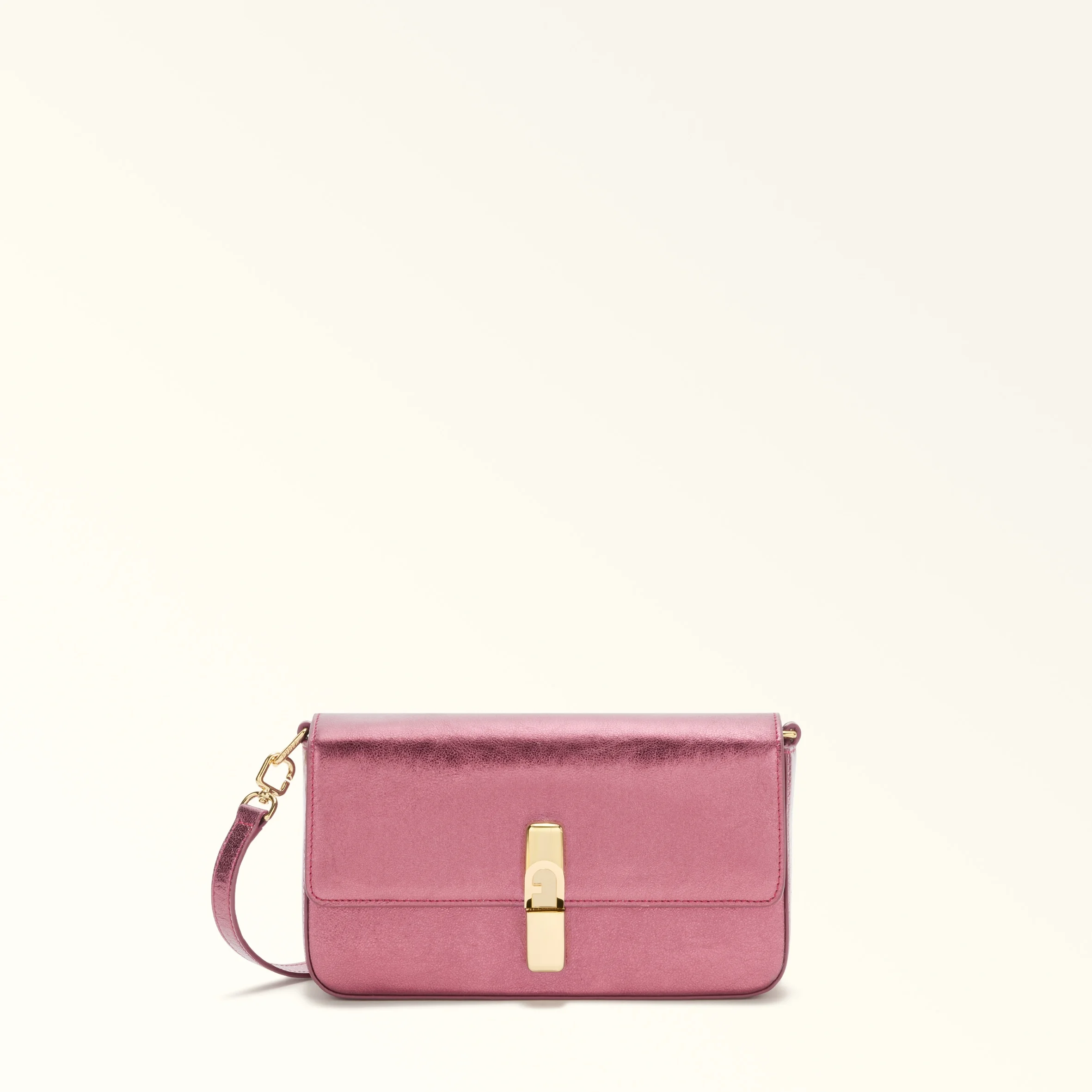 Versatile, contemporary, compact: the Furla Iride crossbody is crafted from luxe metallic leather with a printed texture and features an adjustable, detachable shoulder strap for multiple styling options. Its magnetic closure is embellished with cylindrical metal hardware, finished with the iconic Furla Arch logo. - Inside zip pocket - Printed Furla logo Details Interior Details: 1 Zipped Pocket Exterior Details: Furla Punched Logo Material: Piuma Metal Calf Leather Strap information: Removable/adjustable leather strap Strap Length Max: 46.46 in Strap Length Min: 41.34 in Product Code: WB01826BX415010074147S Plating: Gold Dimensions in INCH 9,45 x 5,12 x 2,36 (w x h x d)