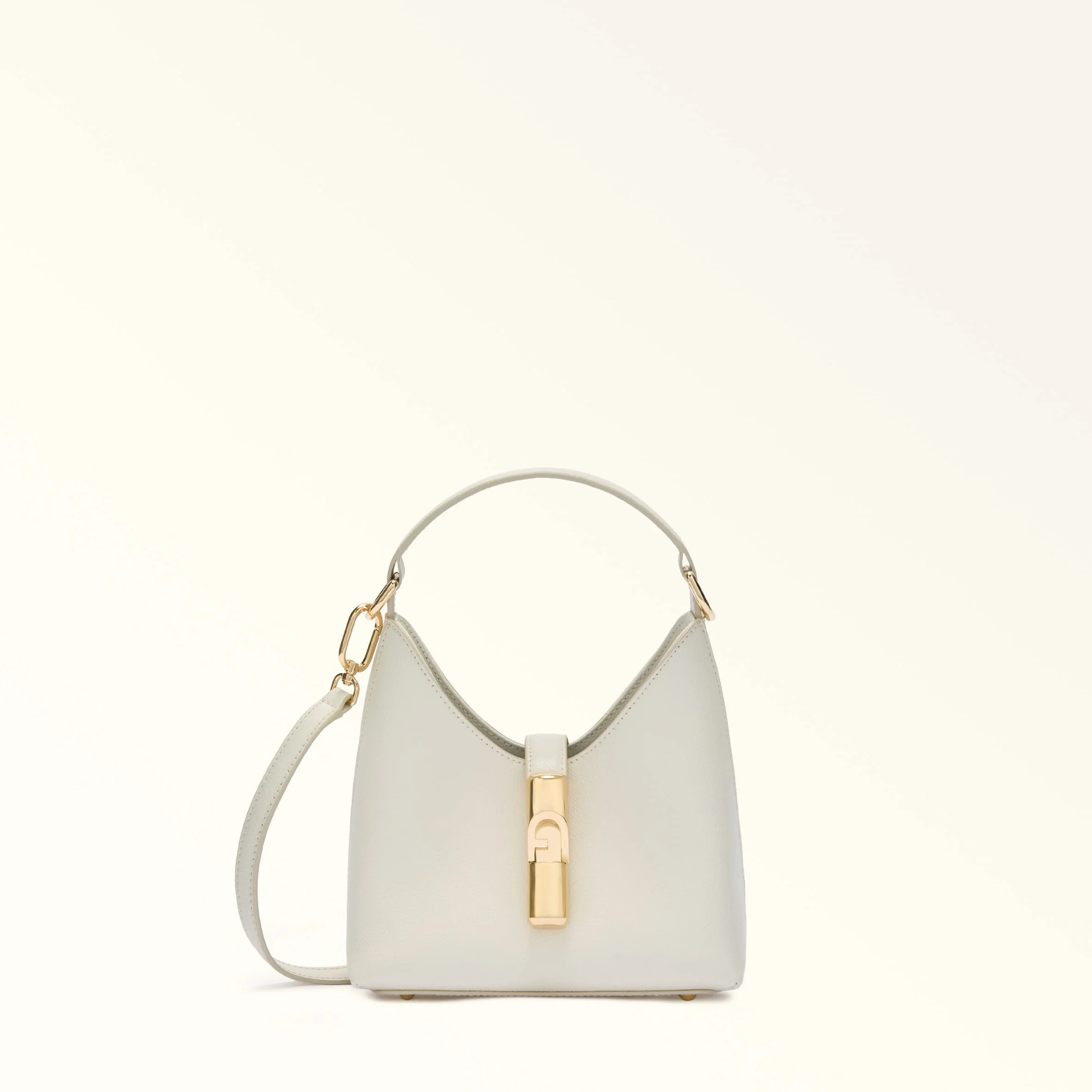Made from printed leather, the Furla Iride mini hobo bag stands out for its soft trapezoidal shape. The accessory's matching tab is embellished with the brand's new cylindrical hardware and the iconic Furla Arch logo. Its compact open interior holds all your essentials. Equipped with a detachable adjustable strap, it can be worn as both a top-handle and on-the-shoulder style for added versatility. - Inside zip pocket - Metal feet - Punched Furla logo Details Interior Details: 1 Zipped Pocket Material: Textured Leather Strap information: Removable/adjustable leather strap Strap Length Max: 38.98 in Strap Length Min: 33.86 in Product Code: WE00876ARE0001007PNN00 Plating: Gold Dimensions in INCH 7,28 x 7,48 x 3,94 (w x h x d)