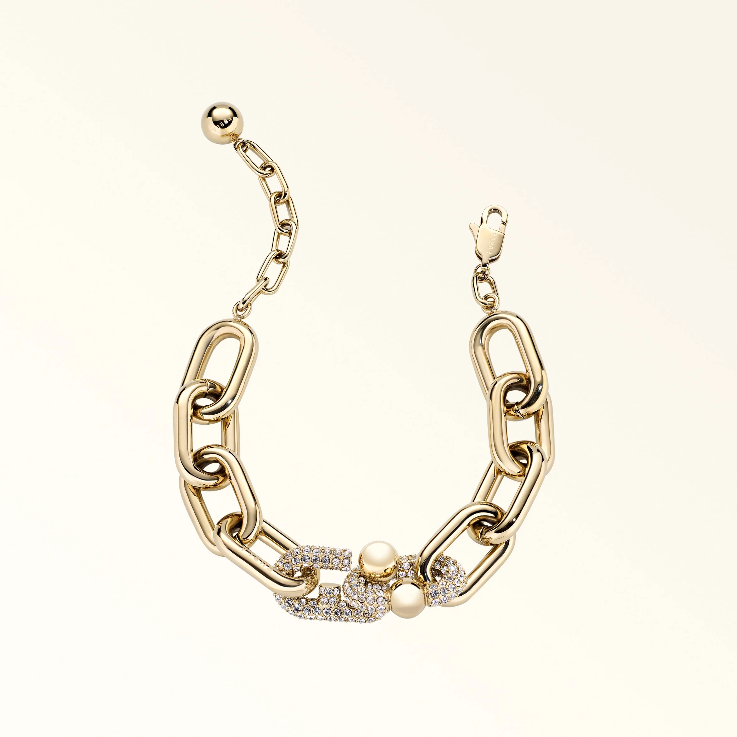 The Furla Mianuvola bracelet features two interlocking Arch elements, an iconic brand signature held together by pearls of metal and embellished with shimmering rhinestones. Its elegant metal chain can be adjusted to different lengths. - Snap hook closure Details Material: Metal + Strass Product Code: WJ00246K210001007OR000 Plating: Gold