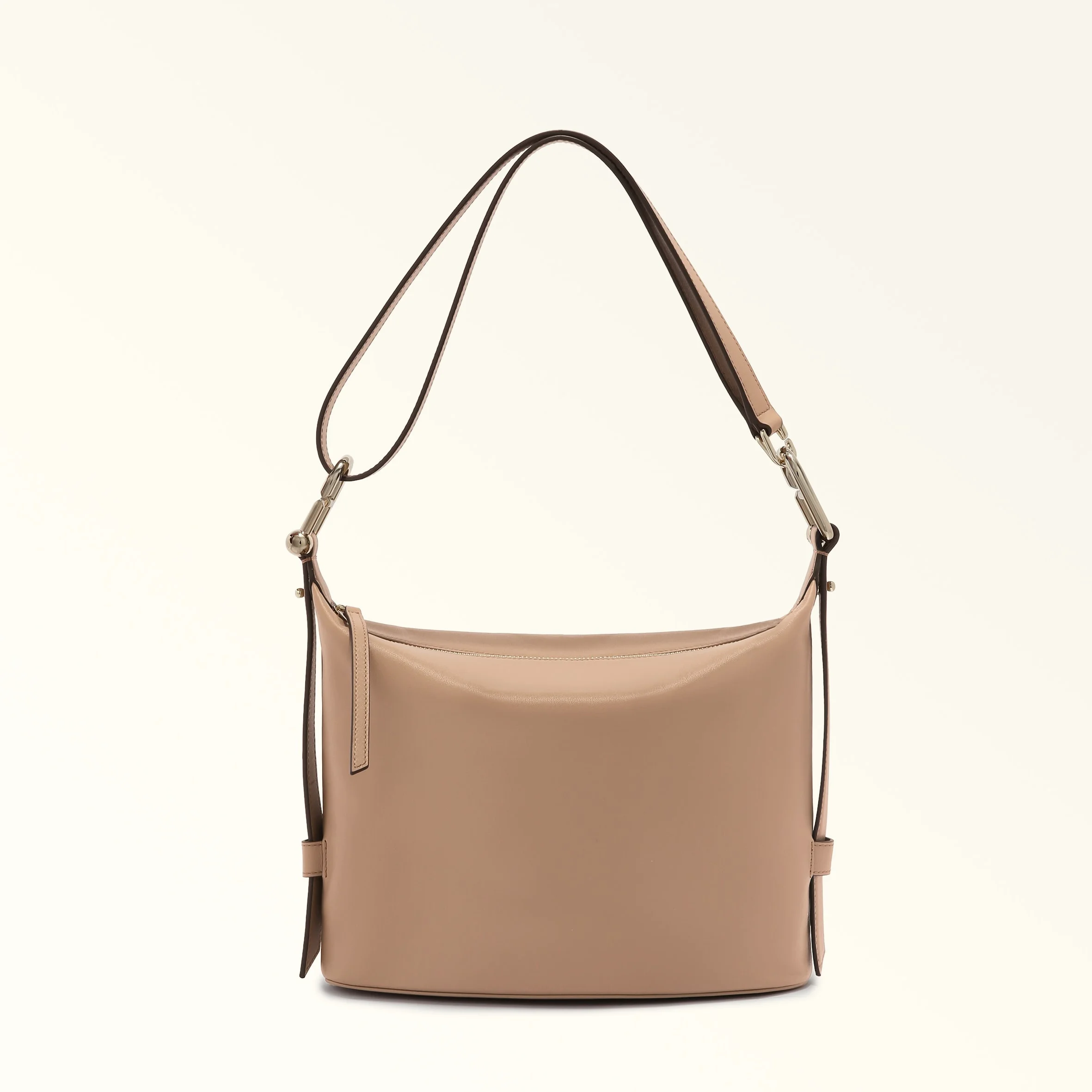 This stylish, compact Furla Nuvola hobo bag boasts geometric lines and a delicate design, and is styled in soft leather with a natural grained finish. The spacious interior features one open compartment suitable for storing all essentials. The removable, adjustable handle stands out thanks to the new version of the Arcosfera hardware, which brings the iconic Furla Arch logo together with the brand's original spherical hallmark. - Inside slip pocket with zip - Stud buttons at the sides to adjust the handle - Zip closure - Furla logo punched on the back Details Exterior Details: Furla Punched Logo/Leather Zip Puller Material: Claris Lux Calf Leather Strap information: Removable/adjustable leather strap Strap Length Max: 44.09 in Strap Length Min: 44.09 in Closure: Zipper Product Code: WB01656BX204510071257S Internal Composition: 100% Polyester External Composition: 100% Leather Plating: Gold Dimensions in INCH 11,02 x 8,46 x 3,94 (w x h x d)