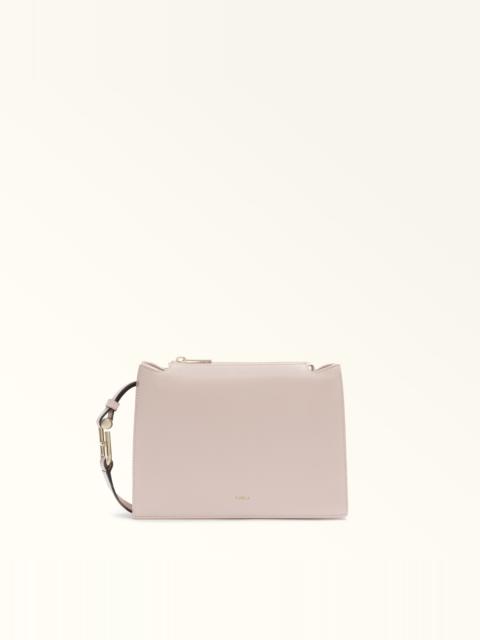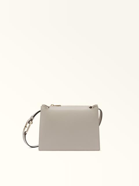 The small Furla Nuvola crossbody exudes a soft, delicate allure. Made of fine textured leather, it features a square geometric silhouette, two open inside compartments with a central divider and a top zip closure. Its detachable shoulder strap has an adjustable length, sitting comfortably on the shoulder or across the body. The Arcosfera hardware adds a unique detail to the bag, combining the iconic Furla Arch logo with the brand's original spherical hallmark. - Open inside pocket - Inside zip pocket - Stud buttons at the sides to adjust the handle - Furla logo punched on the front Details Interior Details: Divider 2 Compartments 1 Zip Pocket Flat Open Pockets Exterior Details: Furla Punched Logo Material: Grained Calf Leather Strap information: Removable/adjustable leather strap Strap Length Max: 41.73 in Strap Length Min: 39.37 in Closure: Zipper Hardware: Furla Arch Ring Cufflinks For Regolation Product Code: WB01275HSF00010074491S Internal Composition: 100% Polyester External Composition: 100% Leather Plating: Gold Weight: 0.6 kg Dimensions in INCH 9,84 x 6,89 x 3,15 (w x h x d)