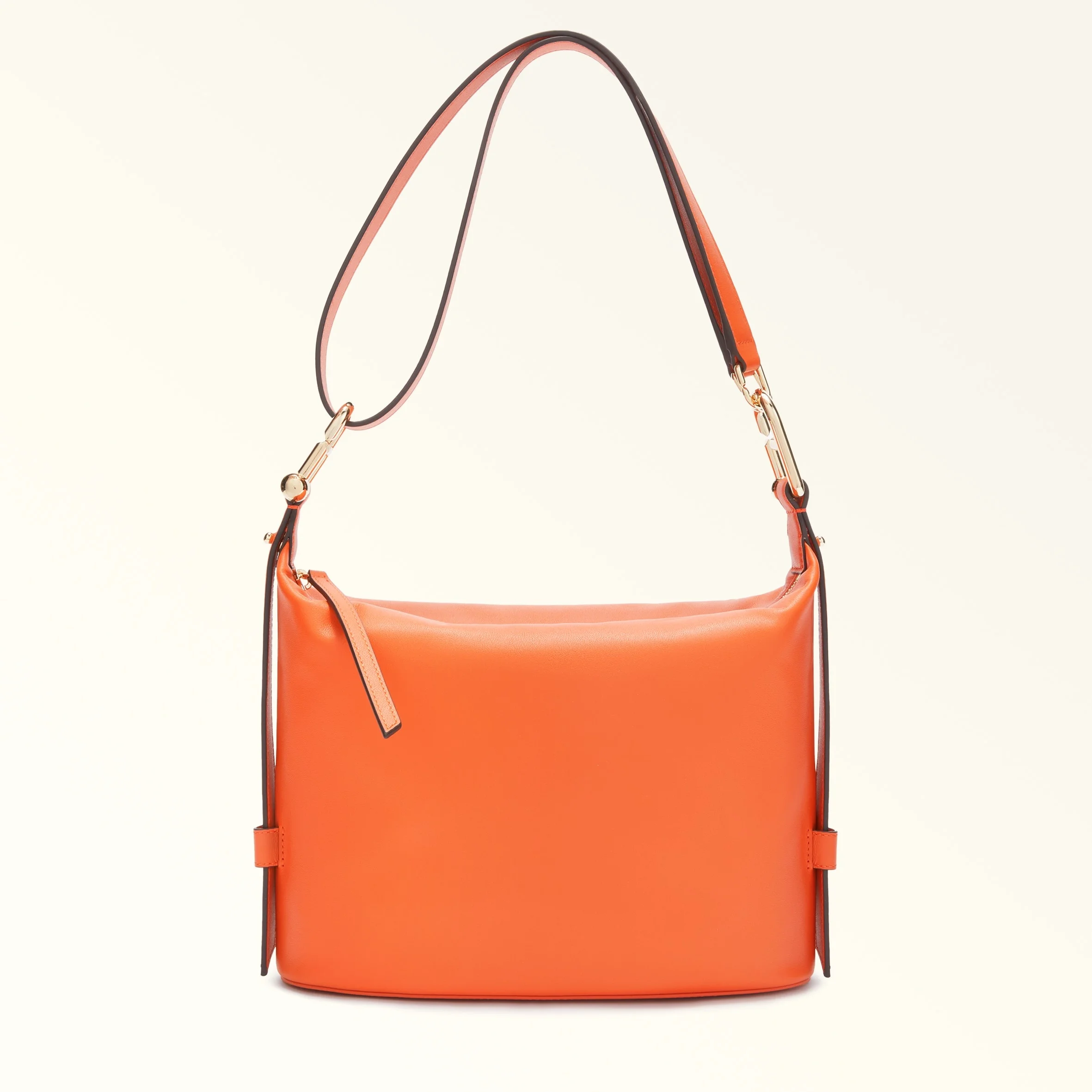 This stylish, compact Furla Nuvola hobo bag boasts geometric lines and a delicate design, and is styled in soft leather with a natural grained finish. The spacious interior features one open compartment suitable for storing all essentials. The removable, adjustable handle stands out thanks to the new version of the Arcosfera hardware, which brings the iconic Furla Arch logo together with the brand's original spherical hallmark. - Inside slip pocket with zip - Stud buttons at the sides to adjust the handle - Zip closure - Furla logo punched on the back Details Exterior Details: Furla Punched Logo/Leather Zip Puller Material: Claris Lux Calf Leather Strap information: Removable/adjustable leather strap Strap Length Max: 44.09 in Strap Length Min: 44.09 in Closure: Zipper Product Code: WB01656BX20451007KP000 Internal Composition: 100% Polyester External Composition: 100% Leather Plating: Gold Dimensions in INCH 11,02 x 8,46 x 3,94 (w x h x d)