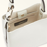 Simple and elegant lines for this new Furla Nuvola bucket bag. Soft and lightweight, it is styled in fine grained leather with a rich and luxurious feel. The small size is comfortable to carry whether in the hand or on the shoulder thanks to the adjustable buttoned handle, made distinctive by the Arcosfera hardware that brings the iconic Furla Arch logo together with the original round element of the brand. - Two open inside pockets - Inside zip pocket - Magnetic button closure - Furla logo punched on the back Details Interior Details: 2 Flat Open Pockets/1 Zipped Pocket Exterior Details: Furla Punched Logo/Single Handle Material: Grained Calf Leather Strap information: Fixed/Adjustable Leather Strap Closure: Magnet Closure Hardware: Furla Arch Ring Cufflinks For Regolation Product Code: WB01373HSF0001007PNN00 Internal Composition: 50% Nylon 50% Polyurethane External Composition: 100% Leather Plating: Gold Dimensions in INCH 7,68 x 7,87 x 5,51 (w x h x d)