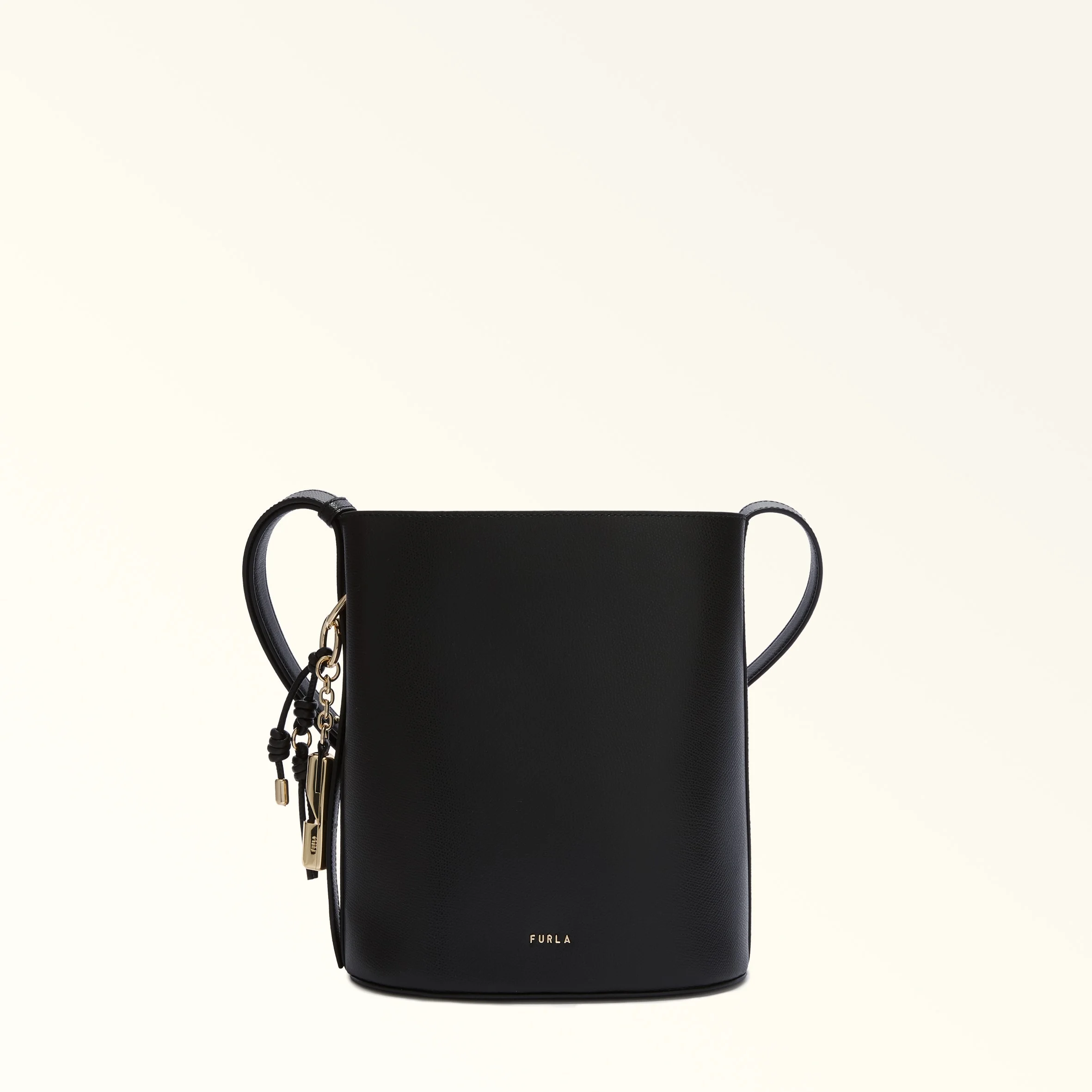 Furla Roxie is a small, compact bucket bag for keeping your essentials close. Featuring a soft and flexible base, its structured design is elevated by precious leather with a printed finish. This accessory sits comfortably in the hand, but can also be worn across the body using its fixed adjustable strap with stud buttons. A detachable cylindrical charm with two braided cords adds a distinctive touch. - Open inside pocket - Magnetic closure - Furla logo print on the front Details Material: Textured Leather Strap Length Max: 38.19 in Strap Length Min: 38.19 in Closure: Magnet Closure Product Code: WB01875ARE0001007O6000 Plating: Gold Dimensions in INCH 9,25 x 9,84 x 6,5 (w x h x d)
