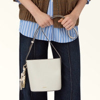 Furla Roxie is the perfect mini bucket bag for keeping your essentials close. Featuring a soft and flexible base, its structured design is elevated by precious leather with a printed finish. This accessory sits comfortably in the hand, but can also be worn across the body using its fixed adjustable strap with stud buttons. A detachable cylindrical charm with two braided cords adds a distinctive touch. - Open inside pocket - Magnetic closure - Furla logo print on the front Details Interior Details: 1 Zipped Pocket Material: Textured Leather Strap Length Max: 46.06 in Strap Length Min: 40.16 in Product Code: WE00859ARE0001007PNN00 Plating: Gold Dimensions in INCH 6,69 x 7,28 x 4,33 (w x h x d)