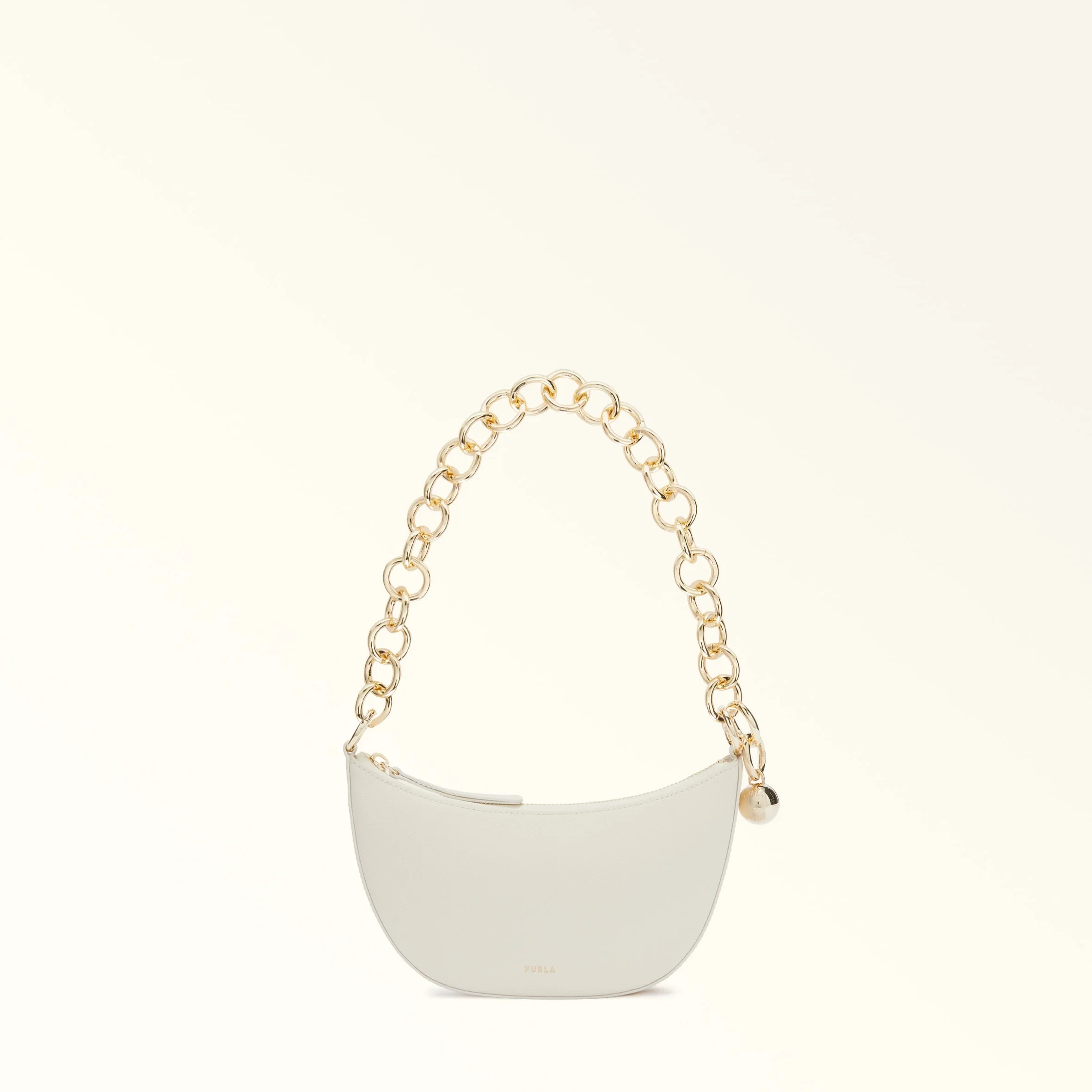 With a flawless contemporary style, the Furla Sfera crossbody has a rounded half-moon silhouette. Made entirely from textured leather, it features a detachable metal chain strap with an iconic Sfera pendant. Its compact saddle-inspired shape is completed by a convenient top zip closure. - Three inner card slots - Furla logo punched on the front Details Interior Details: 3 Cc Slots Exterior Details: Furla Punched Logo/Leather Zip Puller Material: Textured Leather + Metal Chain Product Code: WE00767BX39911007PNN00 Internal Composition: 90% Polyester 10% Leather External Composition: 100% Leather Plating: Gold Dimensions in INCH 6,3 x 4,72 x 1,57 (w x h x d)