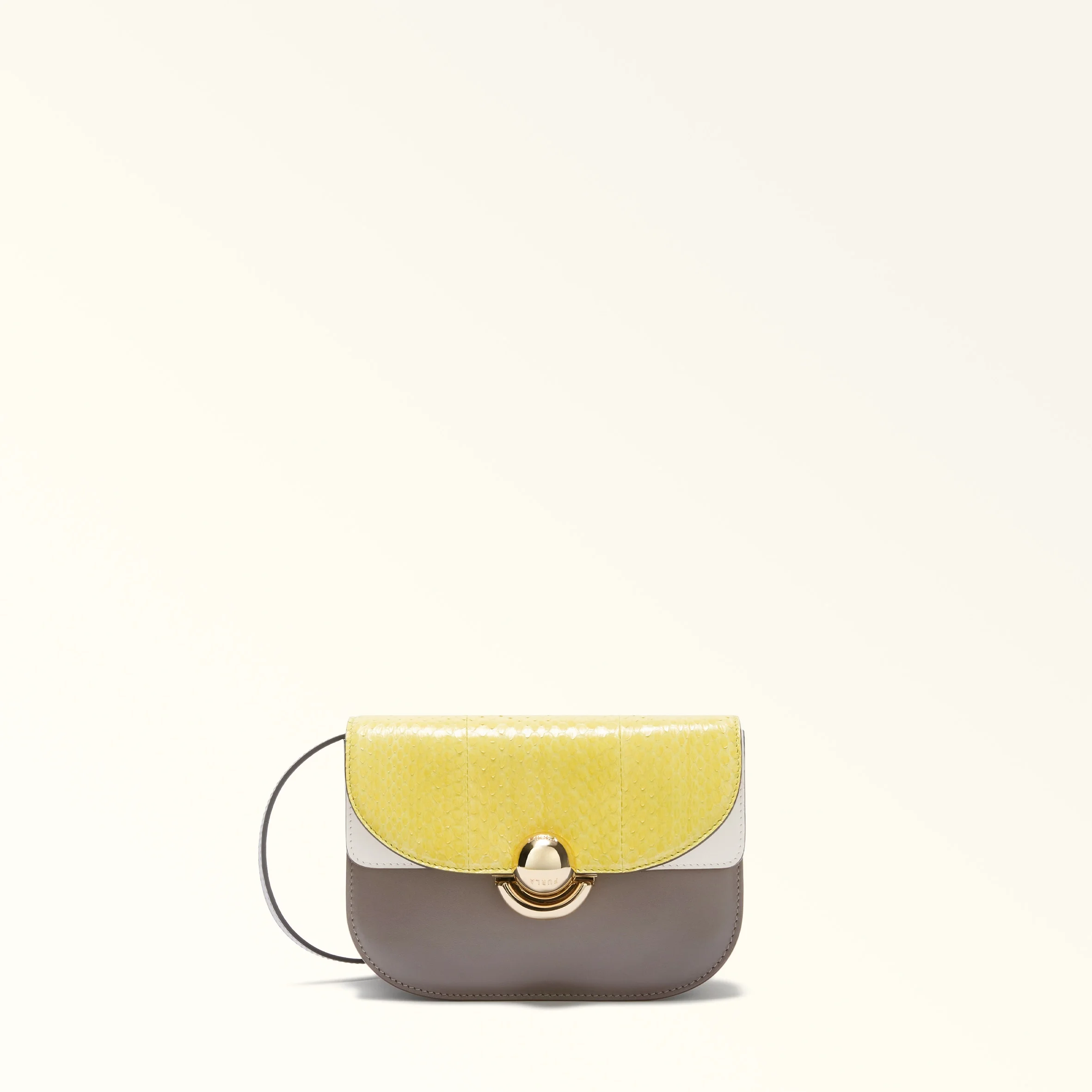 Elegant and unique, this Furla Sfera crossbody bag has a mini saddle design with soft, sweeping lines. Made of smooth calfskin leather, it features contrasting leather details on the inner flap and a rounded Sfera clasp. The accessory sits comfortably on the shoulder, equipped with an adjustable and detachable strap. - Open inside pocket on the front panel - Inside zip pocket Details Material: Elaphe Lux Leather + Soft Calf Leather Strap information: Removable/adjustable leather strap Strap Length Max: 45.28 in Strap Length Min: 38.19 in Product Code: WB01737BX428010074498S Plating: Gold Dimensions in INCH 7,87 x 5,51 x 2,76 (w x h x d)