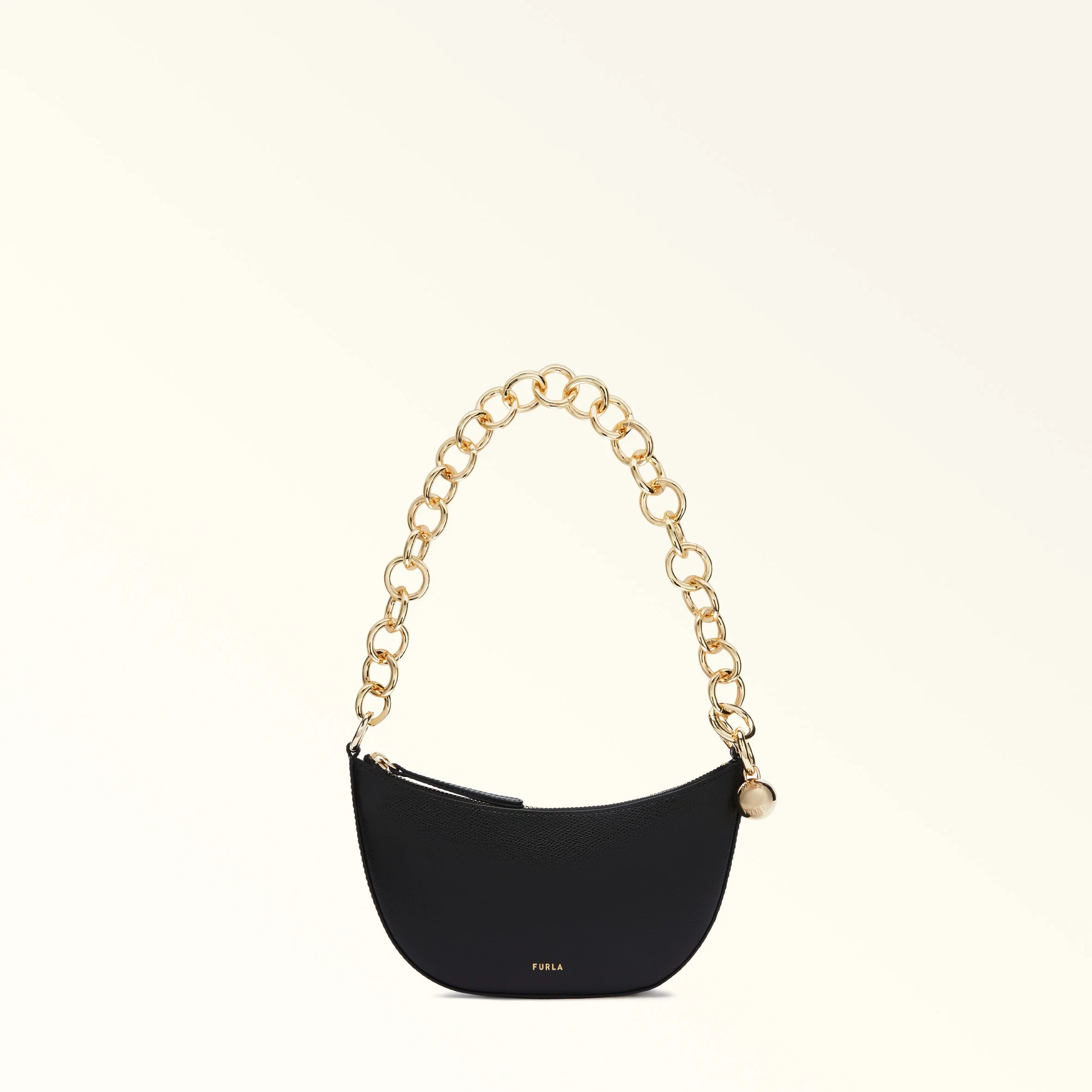 With a flawless contemporary style, the Furla Sfera crossbody has a rounded half-moon silhouette. Made entirely from textured leather, it features a detachable metal chain strap with an iconic Sfera pendant. Its compact saddle-inspired shape is completed by a convenient top zip closure. - Three inner card slots - Furla logo punched on the front Details Interior Details: 3 Cc Slots Exterior Details: Furla Punched Logo/Leather Zip Puller Material: Textured Leather + Metal Chain Product Code: WE00767BX39911007O6000 Internal Composition: 90% Polyester 10% Leather External Composition: 100% Leather Plating: Gold Dimensions in INCH 6,3 x 4,72 x 1,57 (w x h x d)