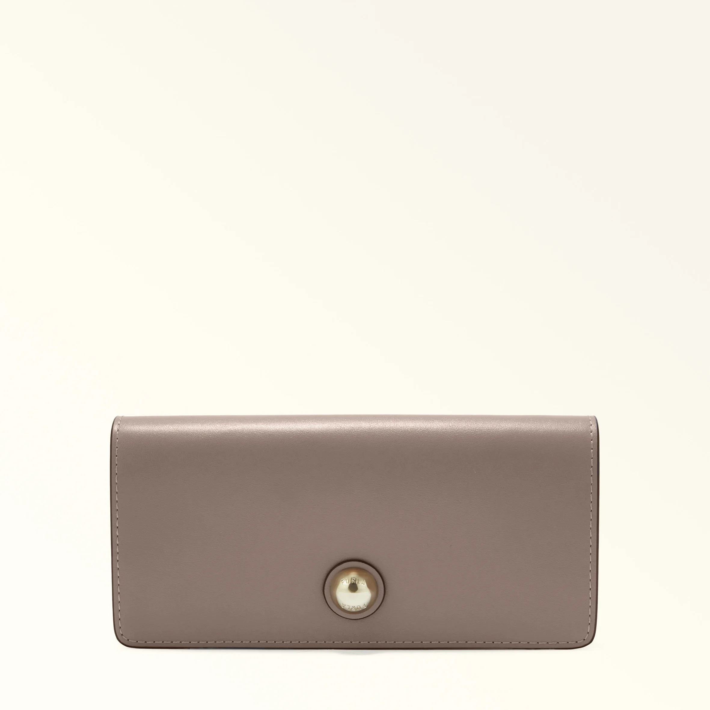 Made of a buttery soft leather, this Furla Sfera continental wallet is a stylish and spacious accessory for keeping your cash, cards and ID organised. Its flap and press-stud closure is embellished with the new galvanised spherical hardware, a nod to the brand's iconic hallmark, making it a gem of an accessory. - Open pocket on the back - Ten inner credit card and ID slots - Two large inner compartments for banknotes - Two side pockets - Inside zip pocket Details Interior Details: 10 Cc Slots/2 Large Compartments/1 Zipped Pocket/2 Banknotes Pockets Exterior Details: 1 Open Pocket On The Back Material: Soft Calf Leather Product Code: WP00441AX07331007MA200 Internal Composition: 100% Viscose External Composition: 100% Leather Plating: Gold Weight: 0.35 kg Dimensions in INCH 7,68 x 3,74 x 0,98 (w x h x d)