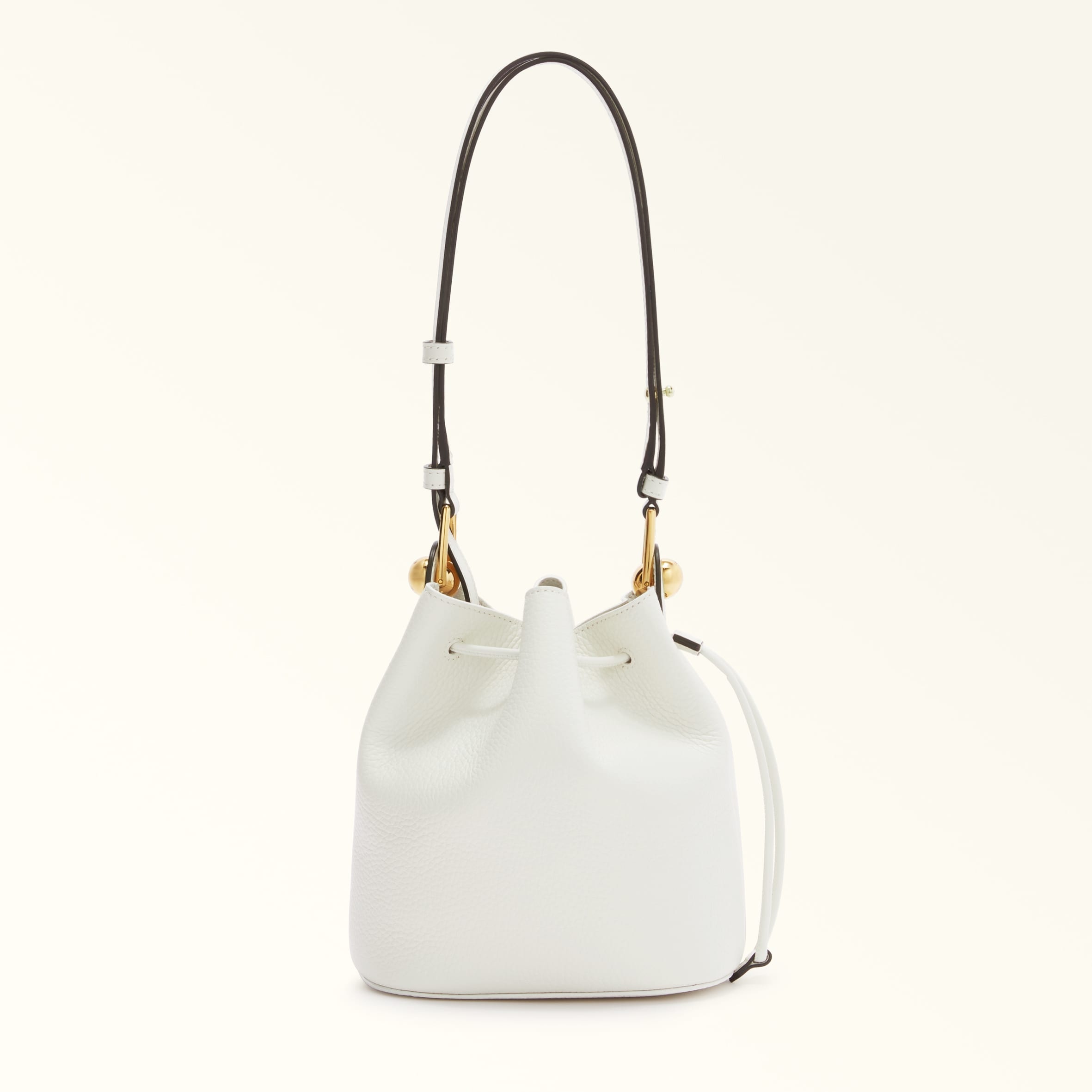 With mini dimensions made for off-duty plans, the Furla Sfera bucket bag is both elegant and practical. Made of exquisite textured leather, it features an adjustable smooth calfskin strap with stud buttons for a comfortable crossbody fit. The Sfera hardware embellishing either side adds some eye-catching sparkle. - Drawstring closure Details Interior Details: 1 Flat Open Pocket Material: Grained Calf Leather + Soft Calf Leather Strap Length Max: 44.09 in Strap Length Min: 40.16 in Closure: Coulisse Closure Product Code: WB01514BX01761002PNN00 Internal Composition: 50% Nylon 50% Polyurethane External Composition: 100% Leather Plating: Polished Bronze Dimensions in INCH 6,89 x 7,87 x 4,72 (w x h x d)