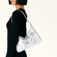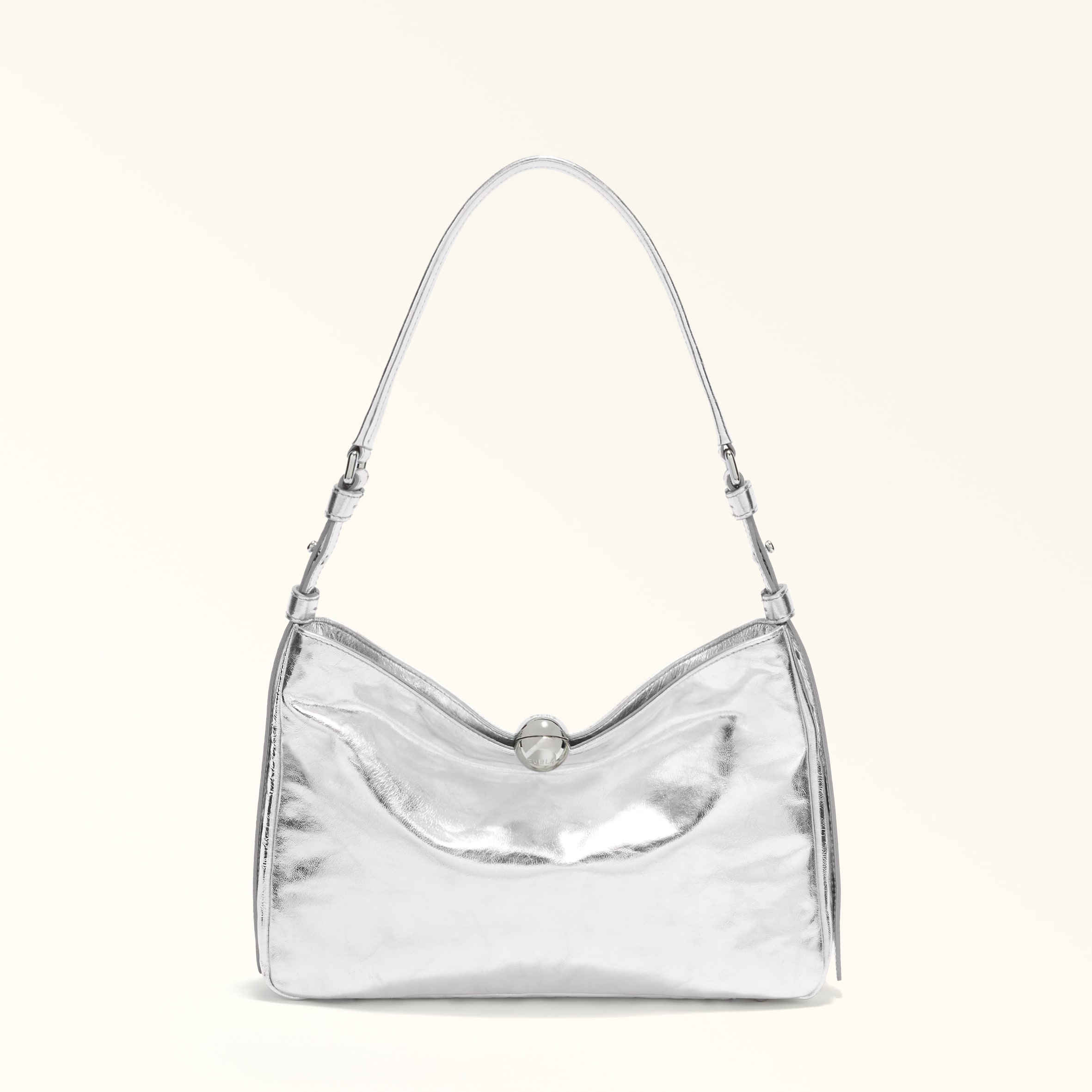 Furla Sfera Soft offers clean lines and a minimal silhouette. The shoulder bag's contemporary design is elevated by soft metallic nappa, its crackle finish creating a dazzling ripple effect. Its shape follows the hollow of your arm, sitting comfortable over the shoulder. Sfera hardware with a magnetic button adds a touch of elegant originality. - Open inside pocket - Inside zip pocket - Adjustable leather handle - Metal feet Details Material: Metallic Crackled Calf Leather Hardware: Metal Feet Product Code: WB01640BX35861003Y3000 Internal Composition: 100% Polyester External Composition: 100% Ovis Aries Leather Plating: Palladium Dimensions in INCH 11,81 x 7,68 x 2,36 (w x h x d)