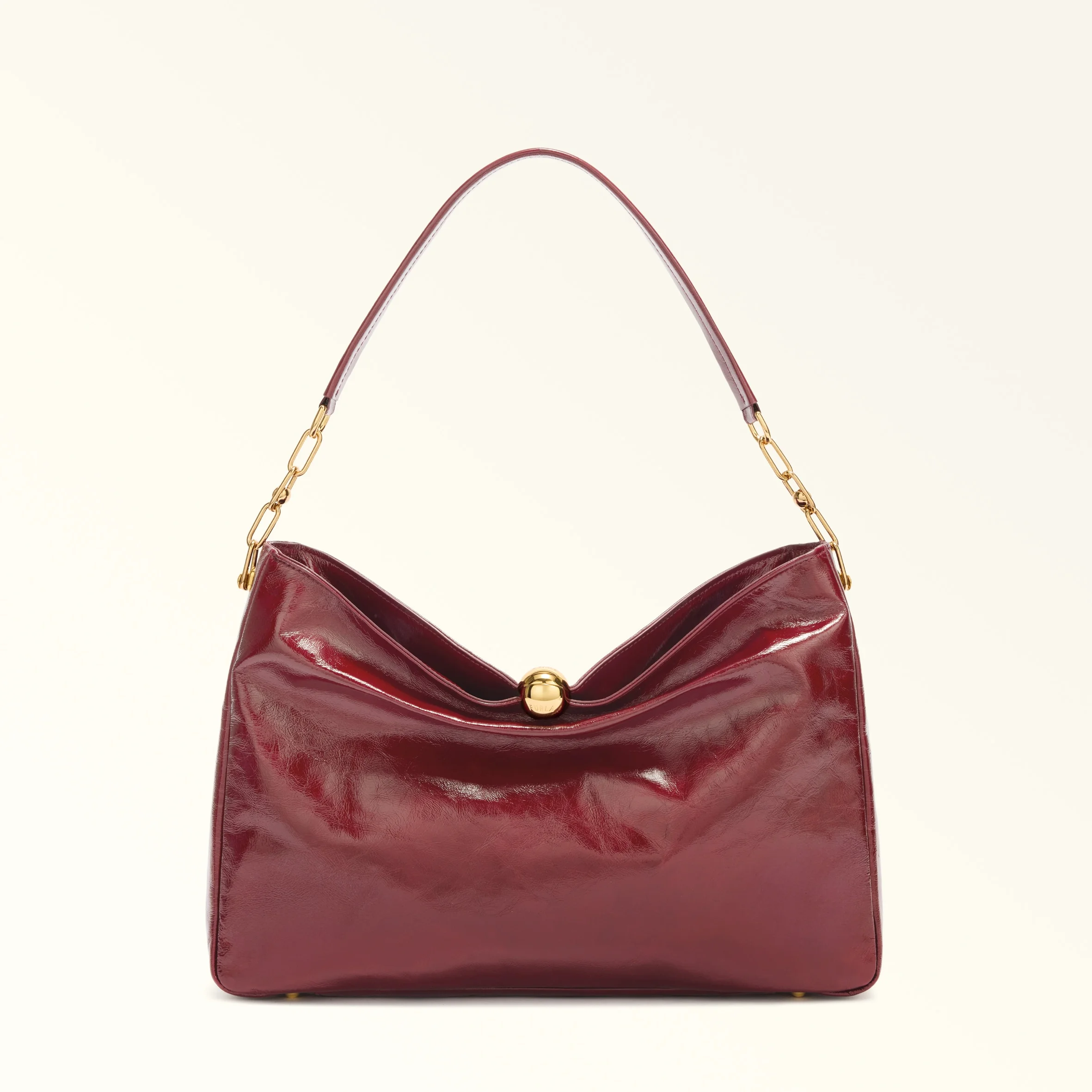 The Furla Sfera Soft bag boasts an elegant design and refined style. Its patent leather moulds under the weight of the round Sfera hardware, creating a natural draped effect. Its large size makes it perfect for storing all your personal items, and its flexible structure makes it suitable for on-the-shoulder wear. - Two inside slip pockets - Inside zip pocket - Adjustable leather handle - Metal feet - Magnetic button closure Details Interior Details: 2 Flat Open Pockets/1 Zipped Pocket Exterior Details: Furla Punched Logo Material: Venice Patent Leather Product Code: WB01885BX410010020053S Plating: Polished Bronze Dimensions in INCH 14,57 x 9,84 x 3,15 (w x h x d)
