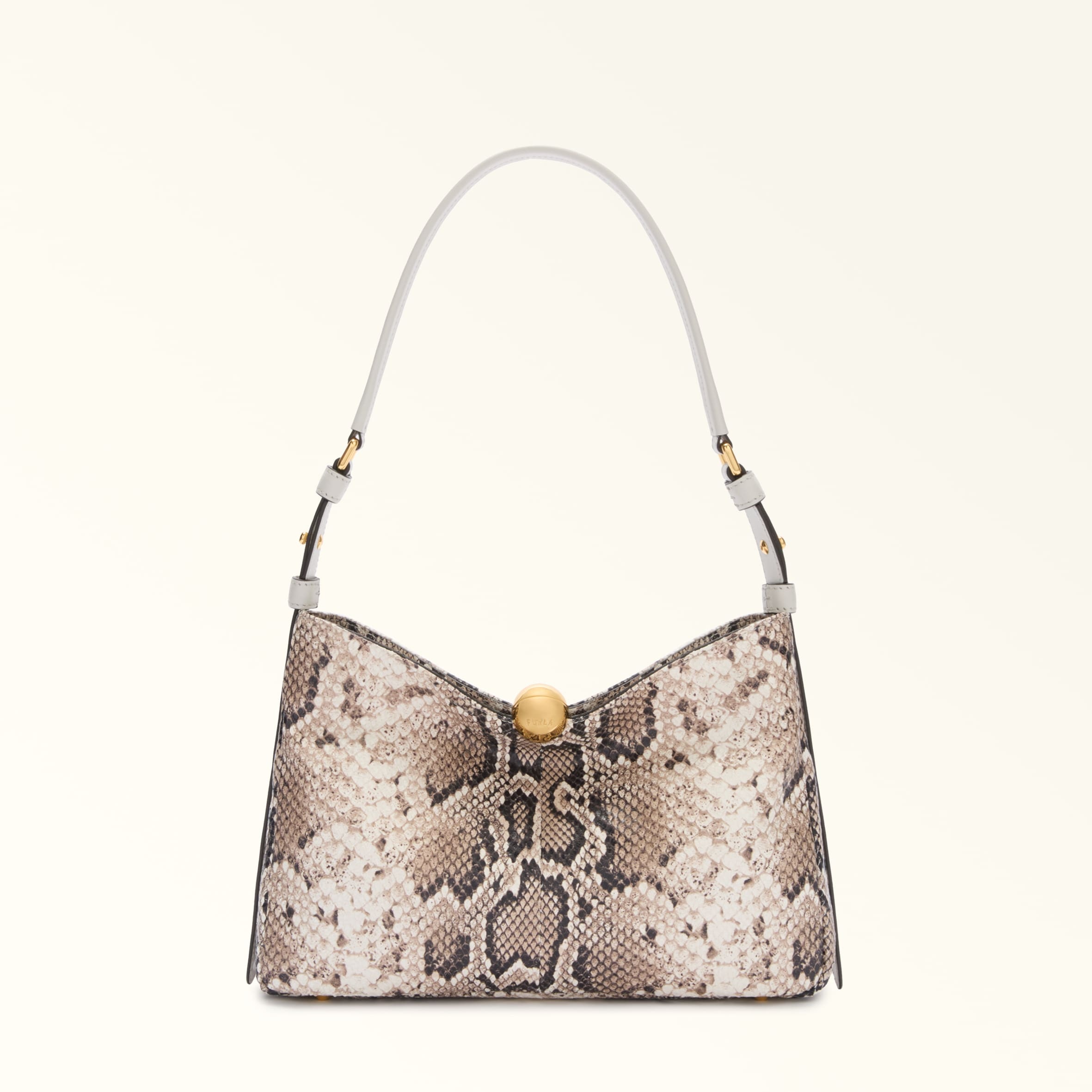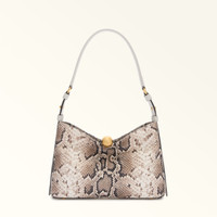 Furla Sfera Soft offers clean lines and a minimal silhouette. The modern design is enhanced by the fine python-print leather used. Its shape follows the hollow of your arm, sitting comfortable over the shoulder. Sfera hardware with a magnetic button adds a touch of elegant originality. - Open inside slip pocket - Inside zipped pocket - Adjustable leather handle - Metal feet Details Material: Python Printed Leather Strap Length Max: 31.69 in Strap Length Min: 31.69 in Hardware: Metal Feet Product Code: WB01640Q820001002TO200 Internal Composition: 100% Polyester External Composition: 80% Ovis Aries Leather 20% Leather Plating: Polished Bronze Dimensions in INCH 11,81 x 7,87 x 2,36 (w x h x d)