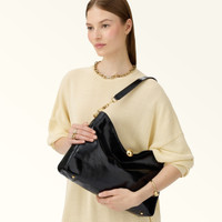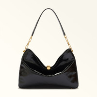 The Furla Sfera Soft bag boasts an elegant design and refined style. Its patent leather moulds under the weight of the round Sfera hardware, creating a natural draped effect. Its large size makes it perfect for storing all your personal items, and its flexible structure makes it suitable for on-the-shoulder wear. - Two inside slip pockets - Inside zip pocket - Adjustable leather handle - Metal feet - Magnetic button closure Details Interior Details: 2 Flat Open Pockets/1 Zipped Pocket Exterior Details: Furla Punched Logo Material: Venice Patent Leather Product Code: WB01885BX41001002O6000 Plating: Polished Bronze Dimensions in INCH 14,57 x 9,84 x 3,15 (w x h x d)