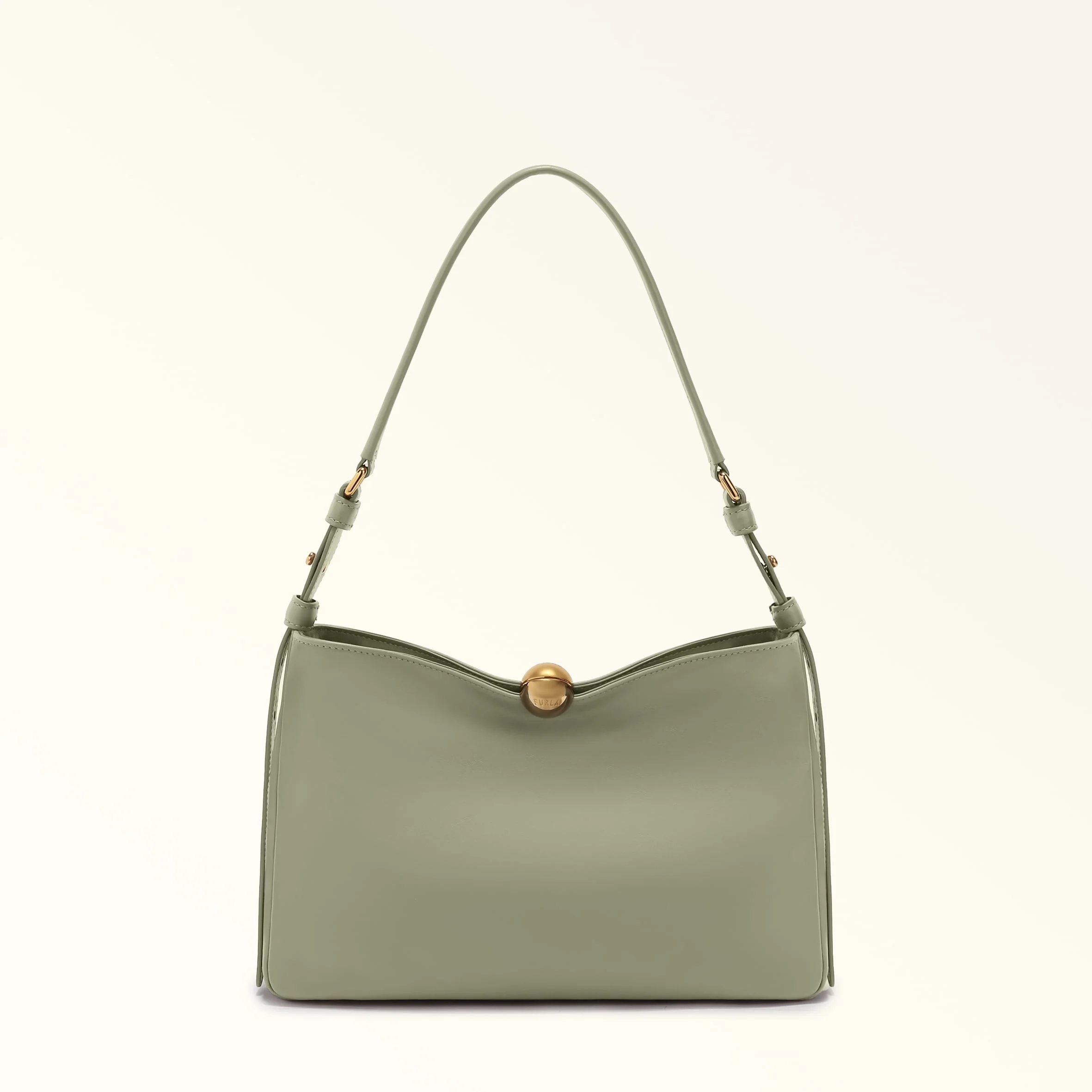 A contemporary piece boasting soft lines and a destructured shape, this Furla Sfera Soft bag has an adjustable handle and compact volume, making it ideal for wearing on the shoulder. Styled in soft padded nappa leather, the bag elegantly fastens with a magnetic closure which creates a natural draping effect, and is embellished with round Sfera hardware. - Open inside pocket - Inside zip pocket - Metal feet Details Exterior Details: Furla Punched Logo Material: Verona Calf Leather Hardware: Metal Feet Product Code: WB01403BX31681002AG700 Internal Composition: 100% Polyester External Composition: 100% Leather Plating: Polished Bronze Dimensions in INCH 11,81 x 7,87 x 2,76 (w x h x d)