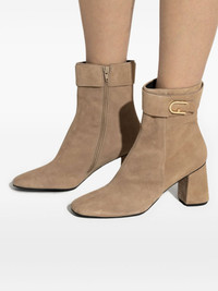 heeled buckle boots Highlights - Beige - Block heel - Side zip fastening - Pointed toe - Ankle height - Buckle detail Imported Composition Outer: Calf Suede 100% Lining: Calf Leather 100%, Fabric 100% Sole: Rubber 100%