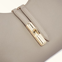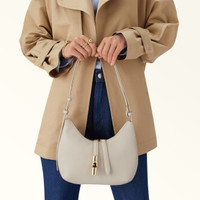 This Furla Goccia shoulder bag is styled in grained leather with contrasting details in smooth leather, and finished with a two-way zip embellished with the unusual cylindrical glossy-finish hardware with the Arch logo on one of the leather pullers. With sleek, curved lines, the rounded shape is compact yet spacious enough for your daily essentials. - Open inside pocket - Inside zip pocket - Adjustable smooth leather handle Details Exterior Details: Furla Punched Logo Material: Night Calf Leather + Sidney Calf Leather Strap information: Fixed/Adjustable Shoulder Strap Closure: Top Zipper Closure Product Code: WB01500BX33531007VAN00 Internal Composition: 100% Polyester External Composition: 100% Leather Plating: Gold Dimensions in INCH 8,66 x 8,27 x 2,95 (w x h x d)