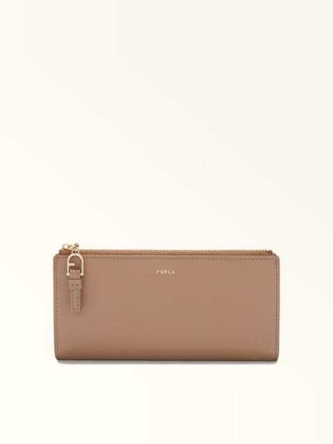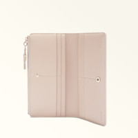 Simple lines and shapes keep this Furla Nuvola continental wallet elegant and functional. The bi-fold design opens to reveal slots and pockets to keep your cash and cards perfectly organised, while the zipped pocket on the front is finished with a Furla Arch logo on the zip pull for a distinctive touch. - Eight inner credit card and ID slots - Two side pockets for banknotes - Press-stud closure - Furla logo printed on the front Details Material: Claris Lux Calf Leather Product Code: WP00457BX204510070496S Internal Composition: 100% Viscose External Composition: 100% Leather Plating: Gold Dimensions in INCH 7,48 x 4,13 x 0,59 (w x h x d)