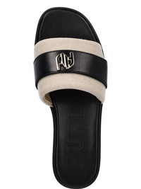logo-plaque leather slides Highlights - Black - Leather upper - Canvas panel - Gold-tone logo plaque - Flat sole - Open toe Imported Composition Lining: Leather 100% Sole: Rubber 100% Outer: Fabric 100%