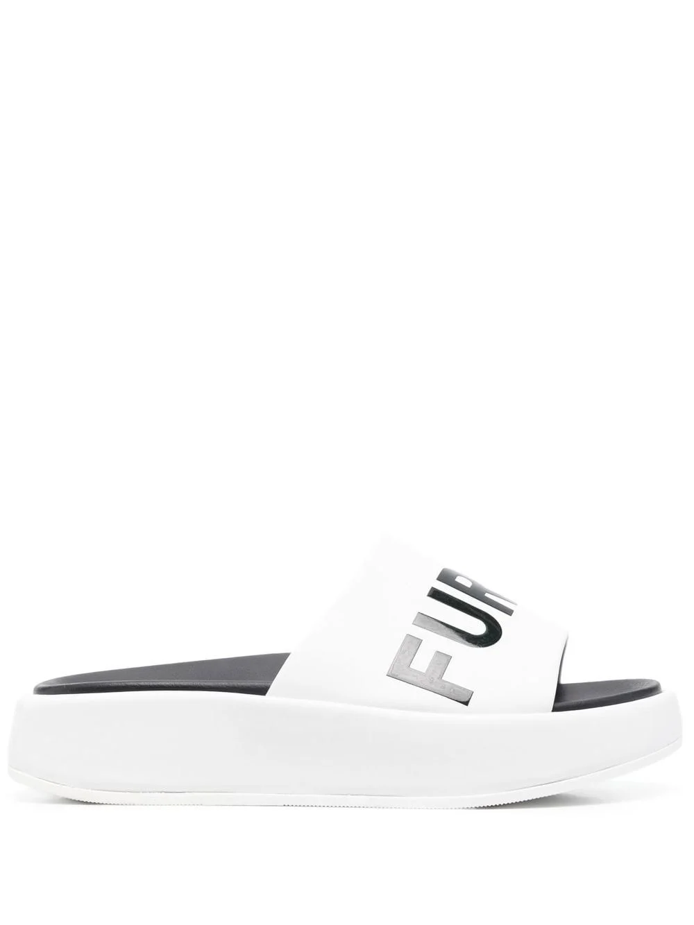 logo-print leather slides Furla presents a minimal take on footwear with these slides from the SS22 collection. Boasting an edgy platform sole, the simple design is enhanced by the two-tone design. Imported Composition Leather 100% SIZE & FIT Measurement HEEL 1.57 in(4 cm)