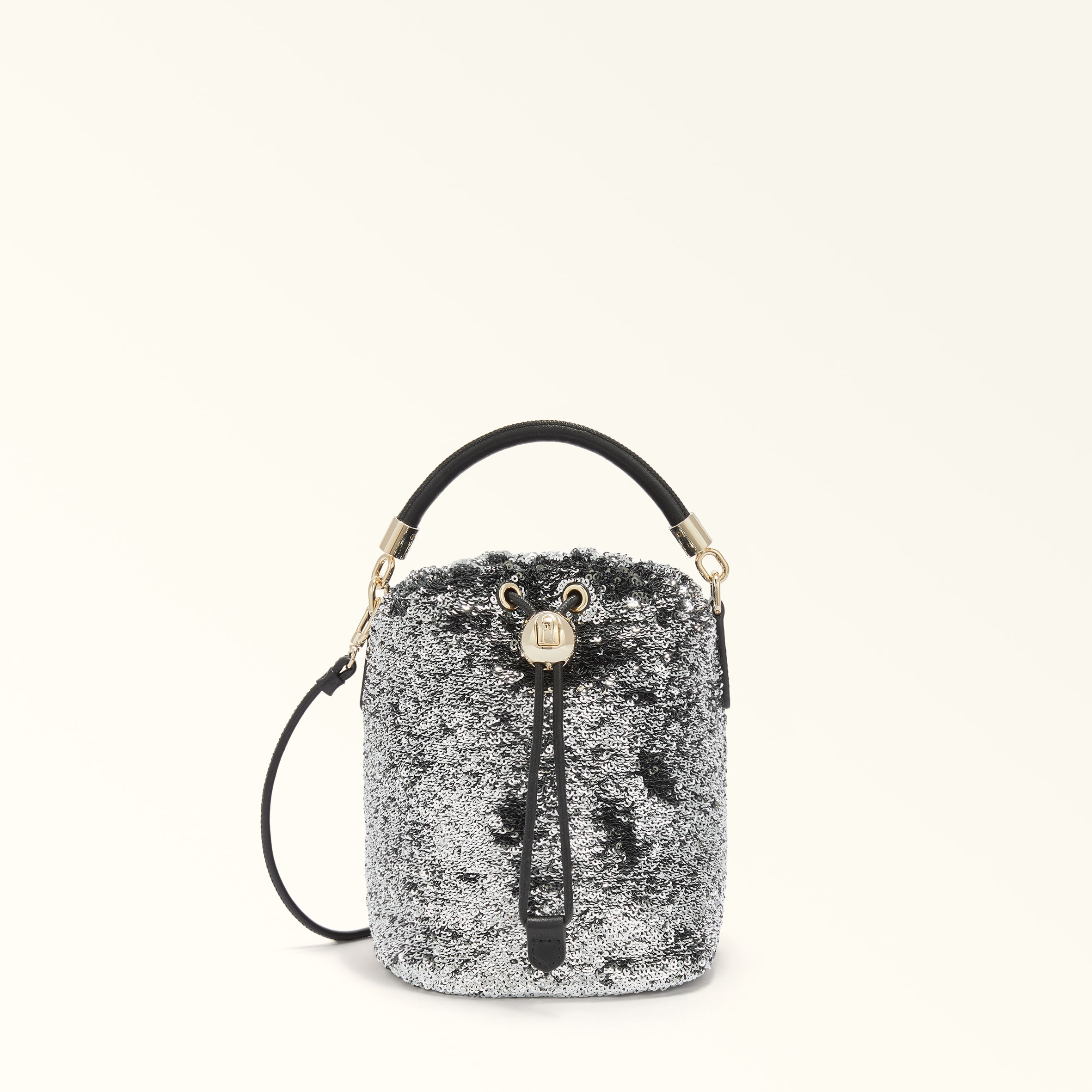 With a shimmer made for the festive season, Furla Mionido is a mini bucket bag offering unstructured elegance. Made of a sequin fabric, its versatile silhouette can be worn either in the hand or across the body using its detachable leather strap and matching handle. - Inside slip pocket - Grosgrain lining - Adjustable drawstring closure Details Interior Details: 1 Flat Open Pocket Material: Paillettes Fabric Strap information: Removable/Non Adjustable Leather Strap Strap Length Max: 46.85 in Strap Length Min: 46.85 in Product Code: WE00663BX137710073566S Internal Composition: 100% Polyester External Composition: 62% Polyethylene terephthalate 20% Leather 15% Polyester 3% Elastan Plating: Gold Dimensions in INCH 4,92 x 6,1 x 4,92 (w x h x d)