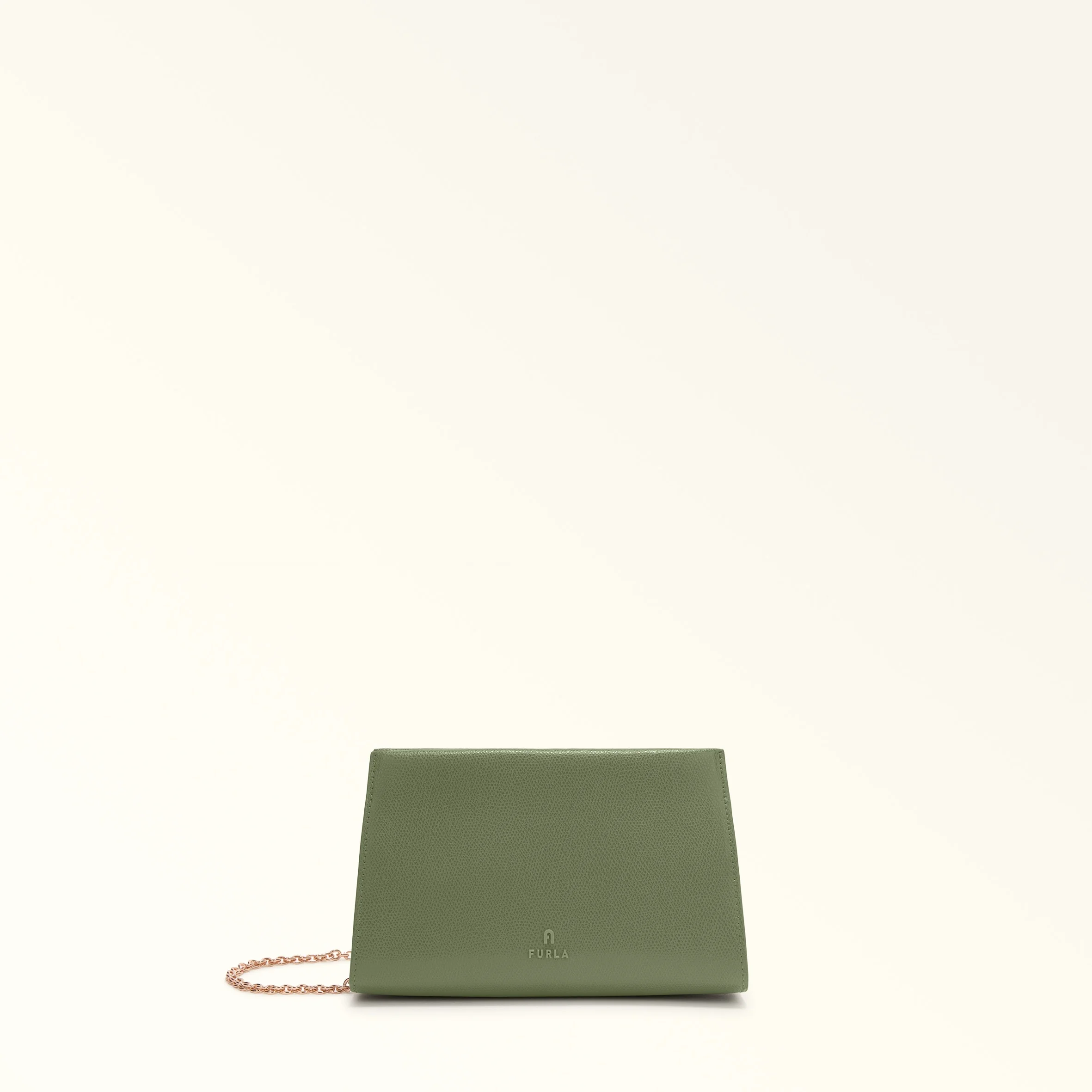 The Furla Myfurla clutch delivers elegant style in miniature form. Made from print-textured leather, it stands out for its geometric trapezoid shape. The chain shoulder strap with leather sections is removable, allowing you to wear it crossbody or carry it as a sophisticated clutch. - Open inside slip pocket - Two side hooks for handle or additional straps - Magnetic closure - Arch and Furla logo punched on the front Details Interior Details: 1 Flat Open Pocket Material: Textured Leather Strap Length Max: 42.52 in Strap Length Min: 42.52 in Product Code: WE00774ARE0001007OLI00 Internal Composition: 100% Polyester External Composition: 100% Leather Plating: Gold Weight: 0.31 kg Dimensions in INCH 8,46 x 5,12 x 2,36 (w x h x d)