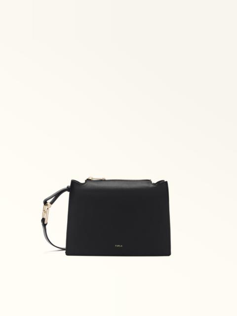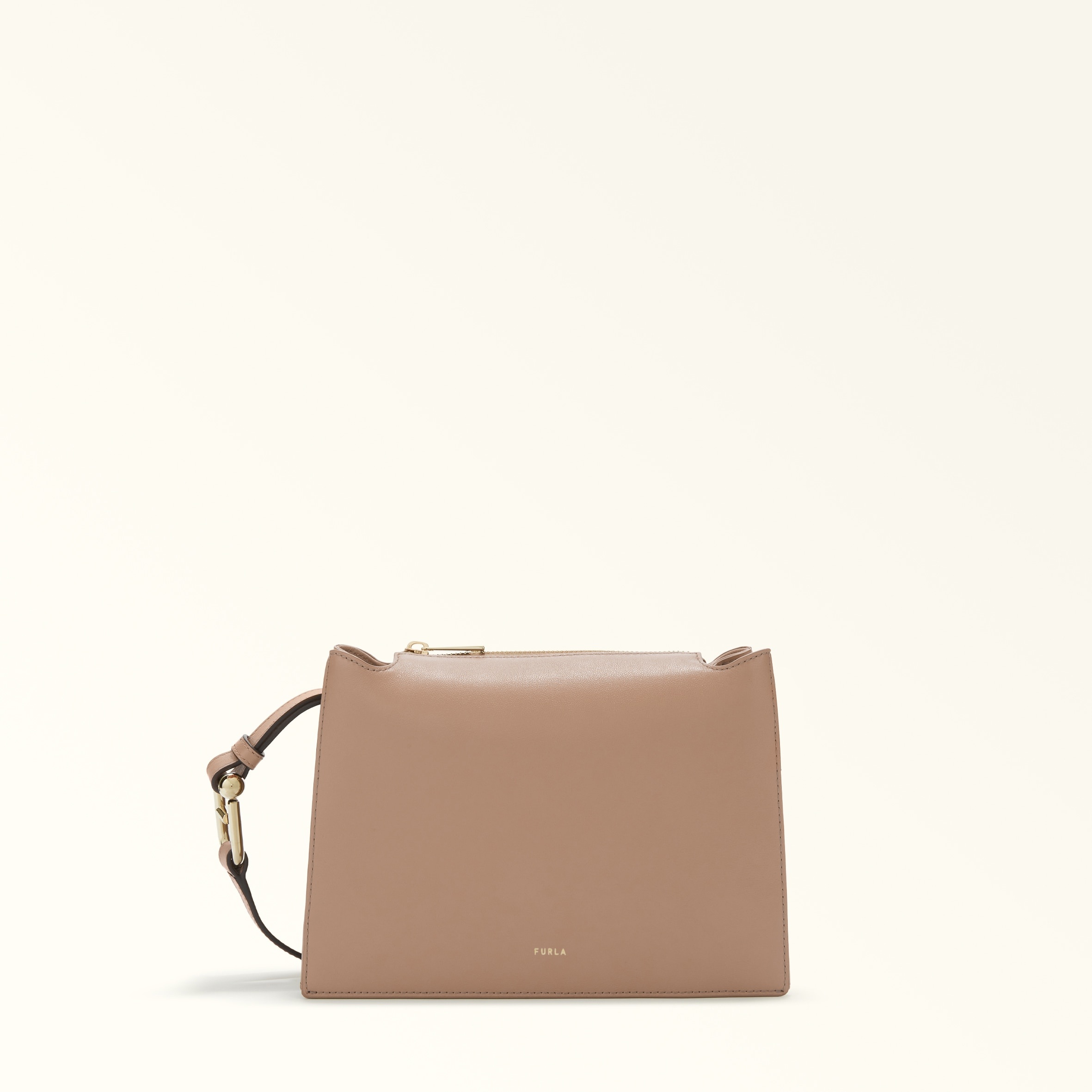 A balance of square geometric lines and soft and delicate appeal is what makes this Furla Nuvola crossbody distinctive. Styled in luxurious leather with a grained finish, it is embellished with the new interpretation of Arcosfera hardware, which brings the iconic Furla Arch logo together with the original round element of the brand, adding an elegant touch. Inside, beyond the zip closure, it has two open compartments and a central partition, and it can be worn crossbody or on the shoulder with the adjustable and removable strap. - Open inside pocket - Inside zip pocket - Stud buttons at the sides to adjust the strap - Furla logo punched on the front Details Interior Details: Divider 2 Compartments 1 Zip Pocket Flat Open Pockets Exterior Details: Furla Punched Logo Material: Claris Lux Calf Leather Strap information: Removable/adjustable leather strap Strap Length Max: 41.73 in Strap Length Min: 39.37 in Closure: Zipper Hardware: Furla Arch Ring Cufflinks For Regolation Product Code: WB01275BX204510071257S Internal Composition: 100% Polyester External Composition: 100% Leather Plating: Gold Dimensions in INCH 9,84 x 6,89 x 3,15 (w x h x d)