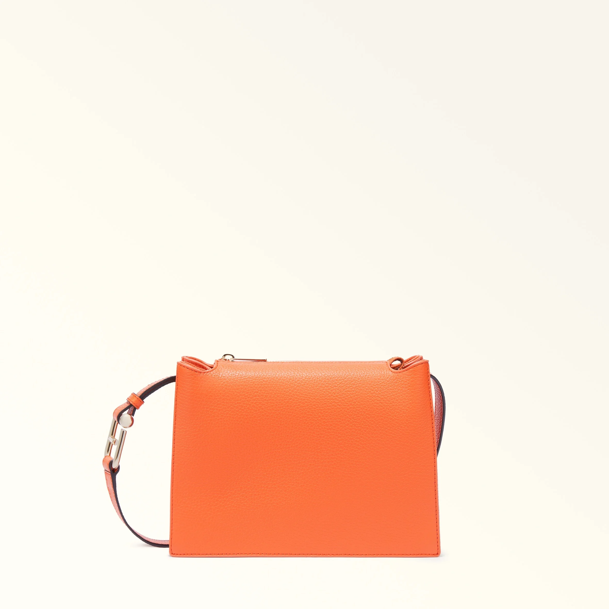 The small Furla Nuvola crossbody exudes a soft, delicate allure. Made of fine textured leather, it features a square geometric silhouette, two open inside compartments with a central divider and a top zip closure. Its detachable shoulder strap has an adjustable length, sitting comfortably on the shoulder or across the body. The Arcosfera hardware adds a unique detail to the bag, combining the iconic Furla Arch logo with the brand's original spherical hallmark. - Open inside pocket - Inside zip pocket - Stud buttons at the sides to adjust the handle - Furla logo punched on the front Details Interior Details: Divider 2 Compartments 1 Zip Pocket Flat Open Pockets Exterior Details: Furla Punched Logo Material: Grained Calf Leather Strap information: Removable/adjustable leather strap Strap Length Max: 41.73 in Strap Length Min: 39.37 in Closure: Zipper Hardware: Furla Arch Ring Cufflinks For Regolation Product Code: WB01275HSF0001007KP000 Internal Composition: 100% Polyester External Composition: 100% Leather Plating: Gold Dimensions in INCH 9,84 x 6,89 x 3,15 (w x h x d)