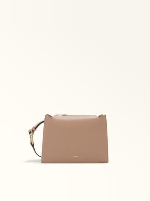 A balance of square geometric lines and soft and delicate appeal is what makes this Furla Nuvola crossbody distinctive. Styled in luxurious leather with a grained finish, it is embellished with the new interpretation of Arcosfera hardware, which brings the iconic Furla Arch logo together with the original round element of the brand, adding an elegant touch. Inside, beyond the zip closure, it has two open compartments and a central partition, and it can be worn crossbody or on the shoulder with the adjustable and removable strap. - Open inside pocket - Inside zip pocket - Stud buttons at the sides to adjust the strap - Furla logo punched on the front Details Interior Details: Divider 2 Compartments 1 Zip Pocket Flat Open Pockets Exterior Details: Furla Punched Logo Material: Claris Lux Calf Leather Strap information: Removable/adjustable leather strap Strap Length Max: 41.73 in Strap Length Min: 39.37 in Closure: Zipper Hardware: Furla Arch Ring Cufflinks For Regolation Product Code: WB01275BX20451007O6000 Internal Composition: 100% Polyester External Composition: 100% Leather Plating: Gold Dimensions in INCH 9,84 x 6,89 x 3,15 (w x h x d)