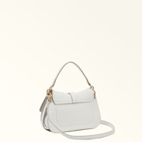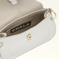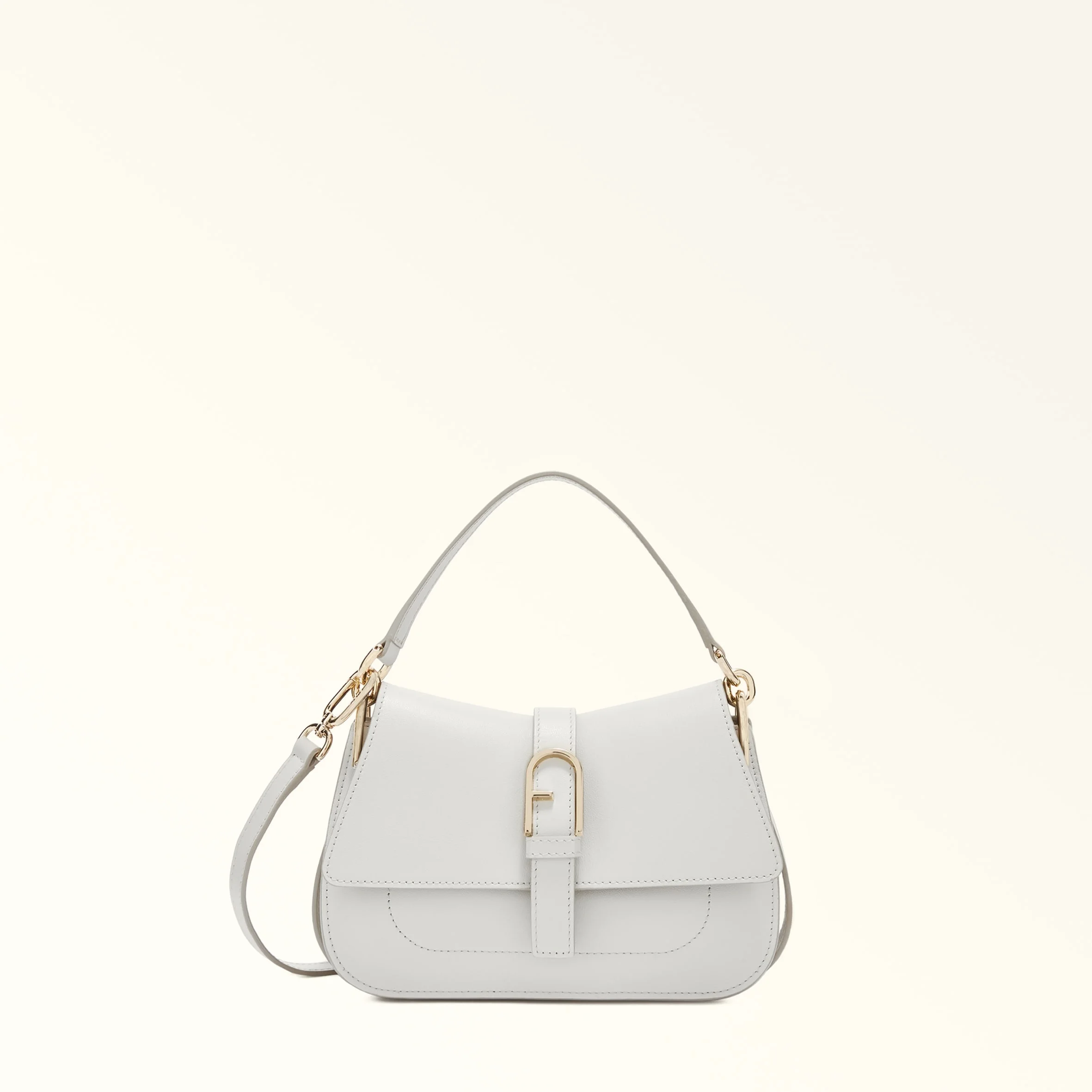 Paired with the decorative iconic Arch buckle on the front, the sleek curves of this Furla Flow mini bag give it the contemporary touch that makes it stand out and capture attention. Just the right size to hold all your small essentials, this sophisticated piece is styled in soft nappa leather and can be carried by hand, worn crossbody or on the shoulder, any time, any place. - Open inside pocket - Short leather top handle - Adjustable and removable long leather strap - Flap and magnetic button closure - Punched Furla logo Details Interior Details: 1 Flat Open Pocket Exterior Details: Furla Logo/Single Handle Material: Claris Lux Calf Leather Strap information: Removable/adjustable leather strap Strap Length Max: 43.7 in Strap Length Min: 38.58 in Closure: Magnet Closure Hardware: Furla Arch Gasket Product Code: WB01032BX204510071704S Internal Composition: 50% Nylon 50% Polyurethane External Composition: 100% Leather Plating: Gold Dimensions in INCH 8,46 x 5,91 x 3,15 (w x h x d)