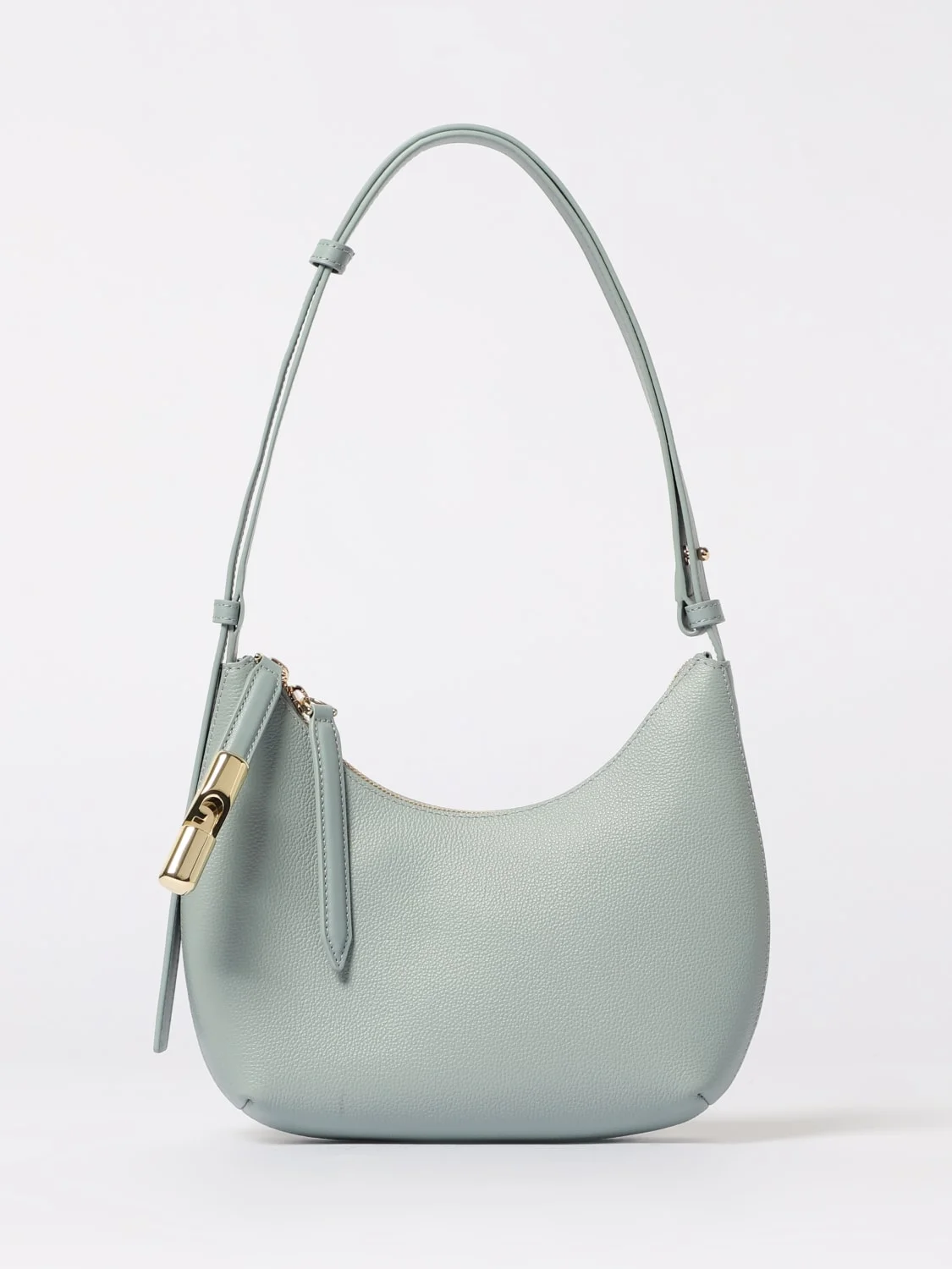 DESCRIPTION - Logo: Back, Laminated - Model: Shoulder - Closure: With zip - Shape: Round - Handle: Adjustable - Materials: Grained leather - Pattern: Plain-colored DETAILS AND CARE Composition 0735-E-100%LEATHER; I-90%PL+10%LEATHER SIZE AND FIT Sizes Width : 22 cm Height: 21 cm Depth: 7,5 cm Designer code: WB01500BX3353 3963S Giglio Code: 434384 Designer: Furla Collection: Furla Woman Category: Bags Furla