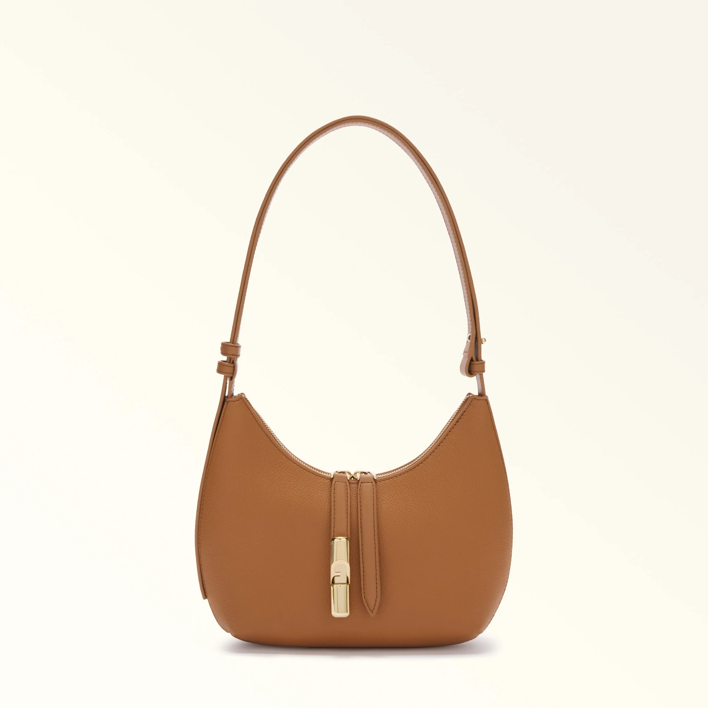 This Furla Goccia shoulder bag is styled in grained leather with contrasting details in smooth leather, and finished with a two-way zip embellished with the unusual cylindrical glossy-finish hardware with the Arch logo on one of the leather pullers. With sleek, curved lines, the rounded shape is compact yet spacious enough for your daily essentials. - Open inside pocket - Inside zip pocket - Adjustable smooth leather handle Details Exterior Details: Furla Punched Logo Material: Night Calf Leather + Sidney Calf Leather Strap information: Fixed/Adjustable Shoulder Strap Closure: Top Zipper Closure Product Code: WB01500BX33531007RY000 Internal Composition: 100% Polyester External Composition: 100% Leather Plating: Gold Dimensions in INCH 8,66 x 8,27 x 2,95 (w x h x d)