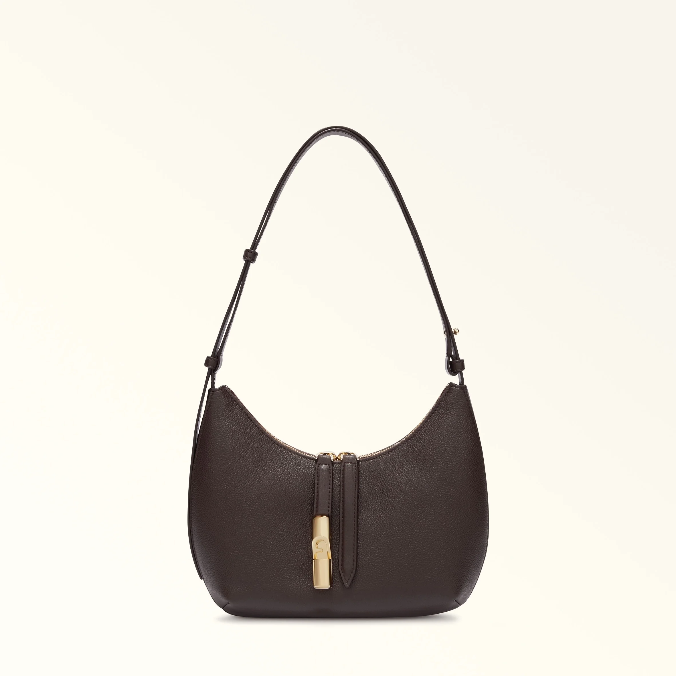 This Furla Goccia shoulder bag is styled in grained leather with contrasting details in smooth leather, and finished with a two-way zip embellished with the unusual cylindrical glossy-finish hardware with the Arch logo on one of the leather pullers. With sleek, curved lines, the rounded shape is compact yet spacious enough for your daily essentials. - Open inside pocket - Inside zip pocket - Adjustable smooth leather handle Exterior Details Furla Punched Logo Material Night Calf Leather + Sidney Calf Leather Strap information Fixed/Adjustable Shoulder Strap Closure Top Zipper Closure Product Code WB01500BX335310072460S Internal Composition 100% Polyester External Composition 100% Leather Plating Gold Dimensions in INCH 8,66 x 8,27 x 2,95 (w x h x d)