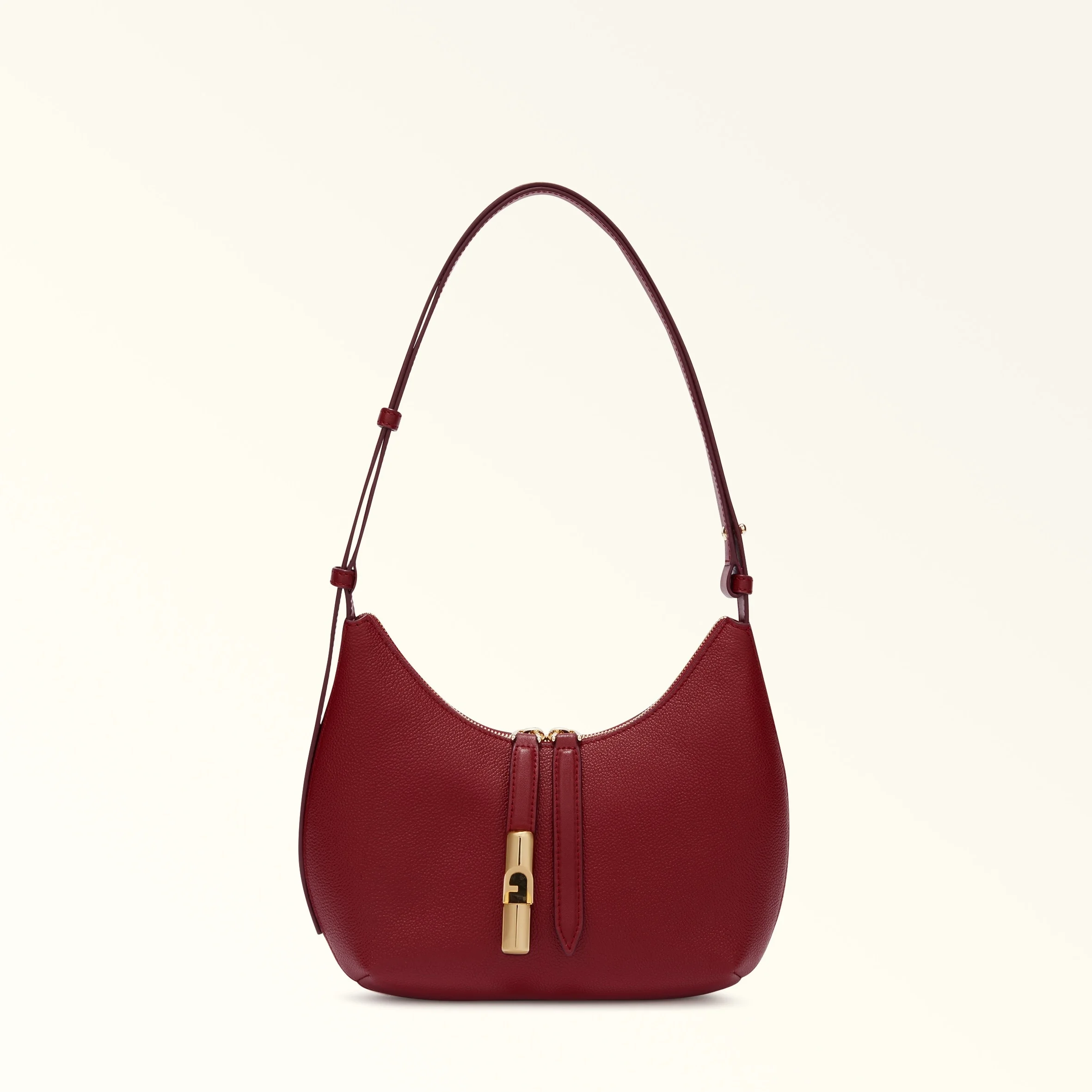 This Furla Goccia shoulder bag is styled in grained leather with contrasting details in smooth leather, and finished with a two-way zip embellished with the unusual cylindrical glossy-finish hardware with the Arch logo on one of the leather pullers. With sleek, curved lines, the rounded shape is compact yet spacious enough for your daily essentials. - Open inside pocket - Inside zip pocket - Adjustable smooth leather handle Exterior Details Furla Punched Logo Material Night Calf Leather + Sidney Calf Leather Strap information Fixed/Adjustable Shoulder Strap Closure Top Zipper Closure Product Code WB01500BX33531007CGQ00 Internal Composition 100% Polyester External Composition 100% Leather Plating Gold Dimensions in INCH 8,66 x 8,27 x 2,95 (w x h x d)