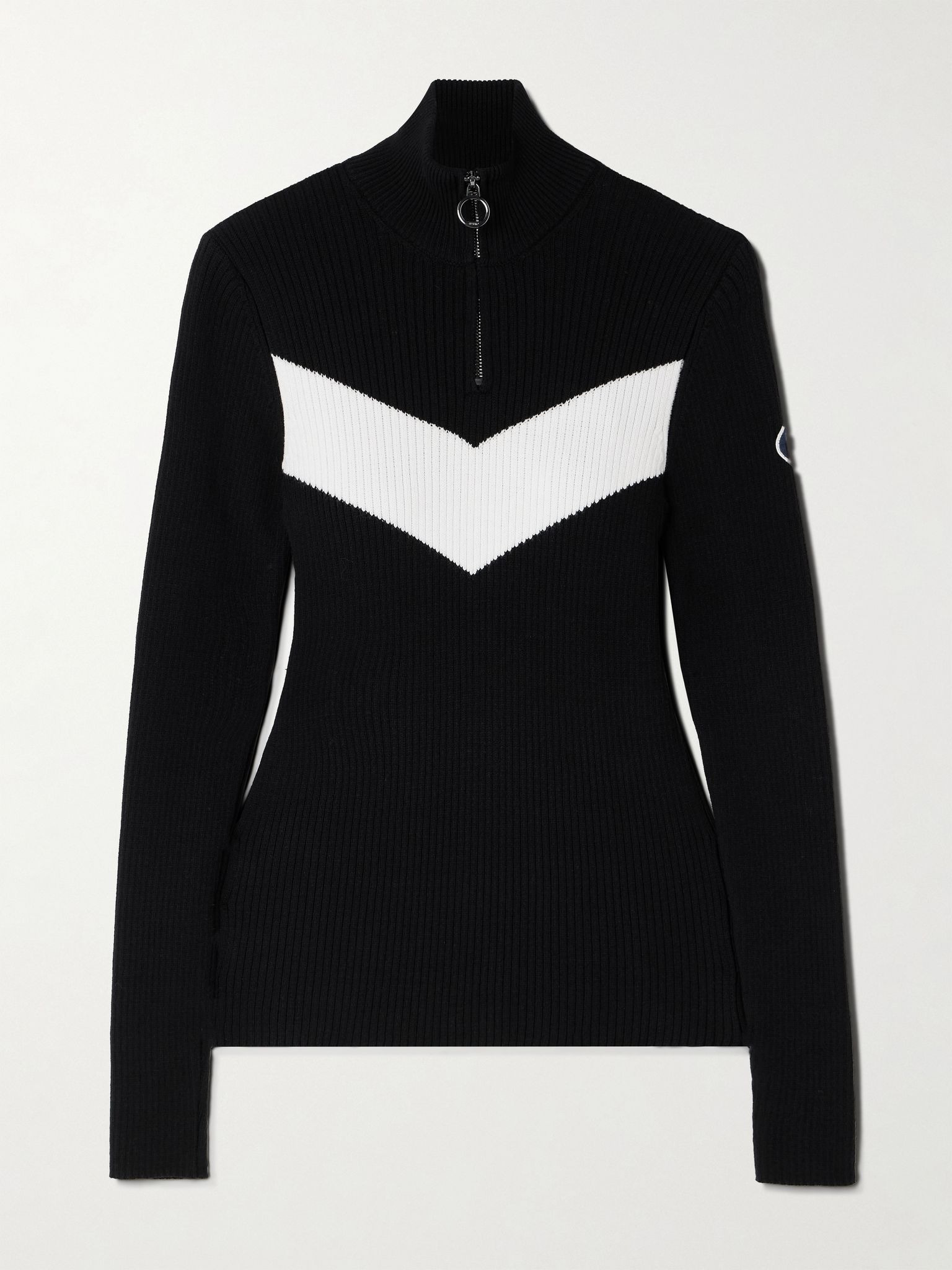 Fusalp's 'Andromede' sweater can be worn as a mid-layer on the slopes, or solo at apres ski drinks afterwards. It's rib-knitted for a close fit with a signature chevron stripe and cozy turtleneck – keep it fastened to stay warm or unzip for a more casual look. Lower-Impact Materials. This product is made using at least 50% lower-impact materials or ingredients. Find out more about our NET SUSTAIN criteria here. Size & Fit - Fits true to size, however those who are between sizes should take the larger size - Designed for a close fit - Mid-weight knit - Model is 175cm/ 5'9" and is wearing a size Medium Model measurements: - Bust: 80cm/ 31.5" - Waist: 69cm/ 27” - Hip: 95cm/ 37.5” Details & Care - Black and white ribbed-knit - Zip fastening along front - 70% viscose, 30% polyester - Hand wash or dry clean