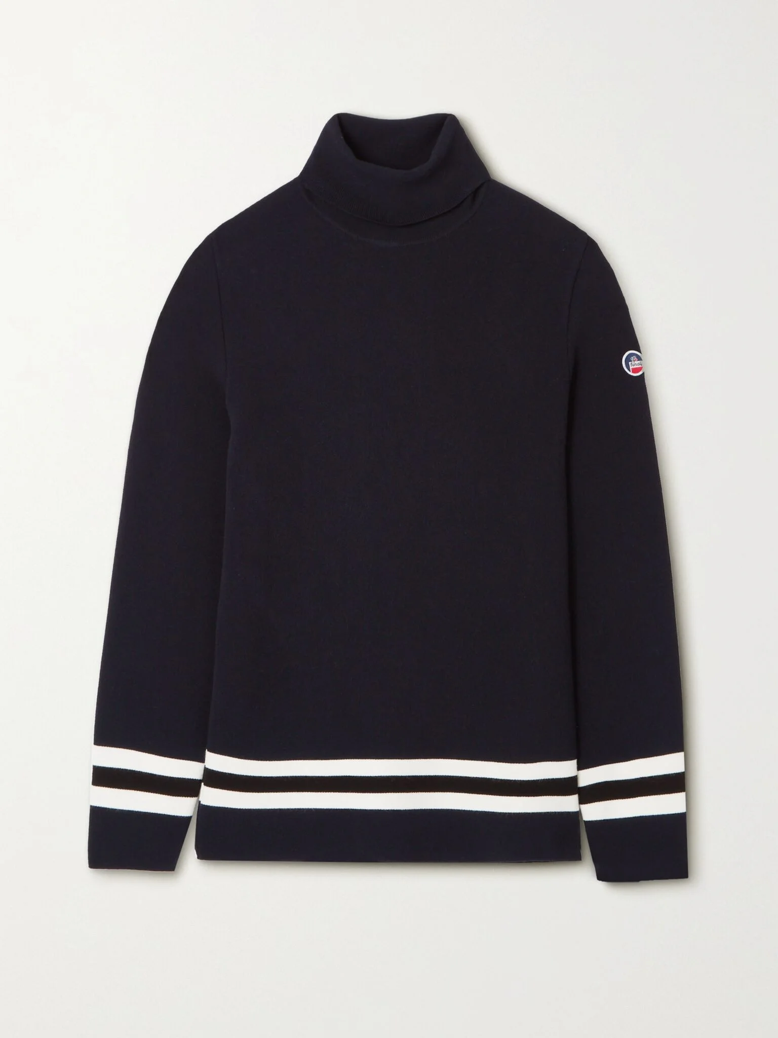 Fusalp's 'Judith' turtleneck sweater is a warm choice for long days on the slopes. It's knitted from navy EcoVero™ viscose and has a block stripe at the hem - a brand signature. The slim fit means you can wear it as a base layer underneath your jacket or solo for apres-ski activities. Size & Fit - Fits true to size, take your normal size - Designed for a slim fit - Can be worn alone or as a base layer - Mid-weight knit - Model is 177cm/ 5’10” and is wearing a size Small Details & Care - Navy, white and black viscose-blend - Slips on - 70% viscose, 30% polyester - Machine wash